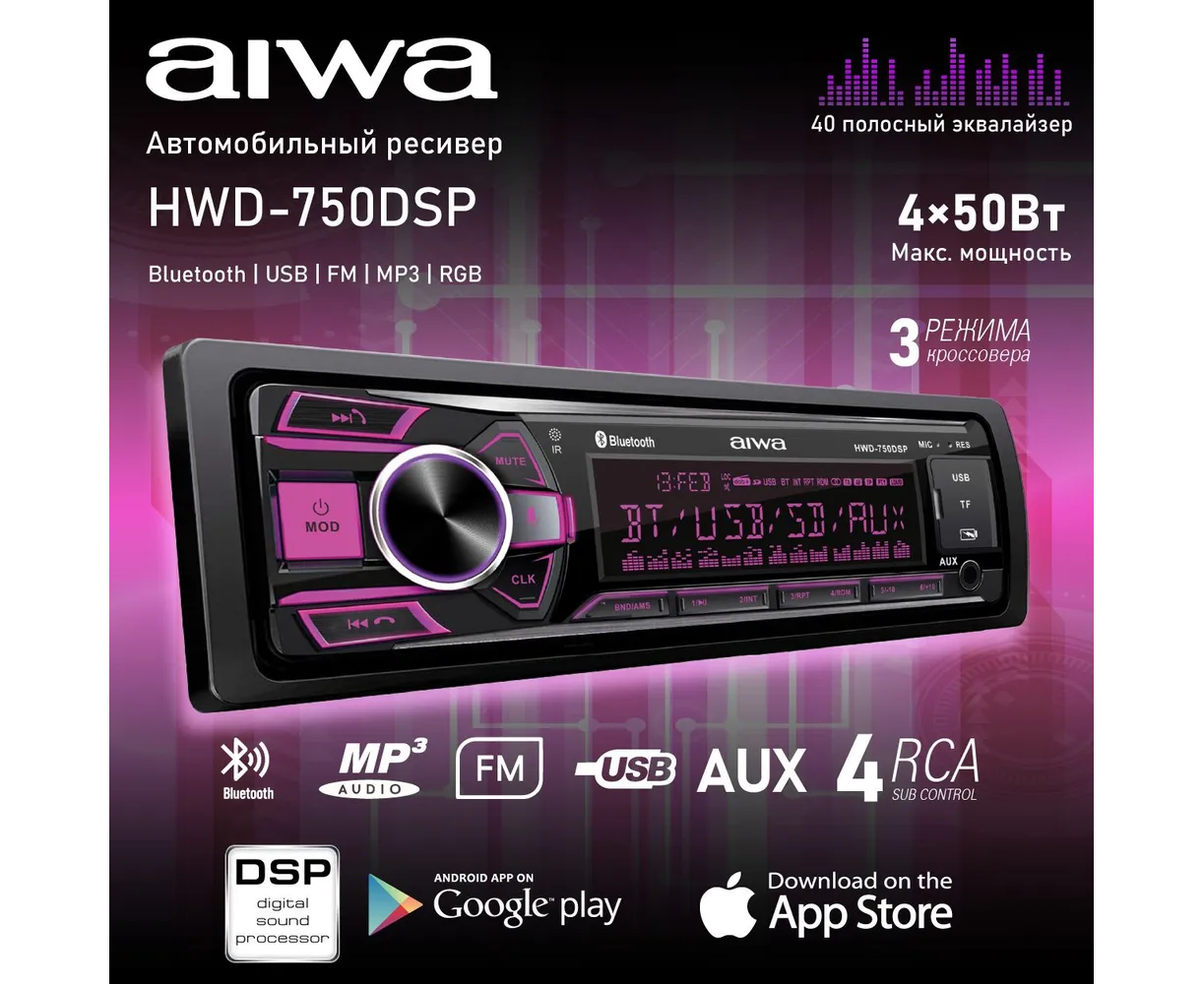 Автомагнитола AIWA HWD-750DSP с поддержкой функции Bluetooth, обеспечивающая качественное и громкое звучание благодаря своей максимальной выходной мощности 4х50 Вт и поддержке форматов FLAC/WAV/WMA/MP3. Встроенный DSP-процессор и 40-полосный эквалайзер позволяют точно настроить звук под ваши предпочтения.