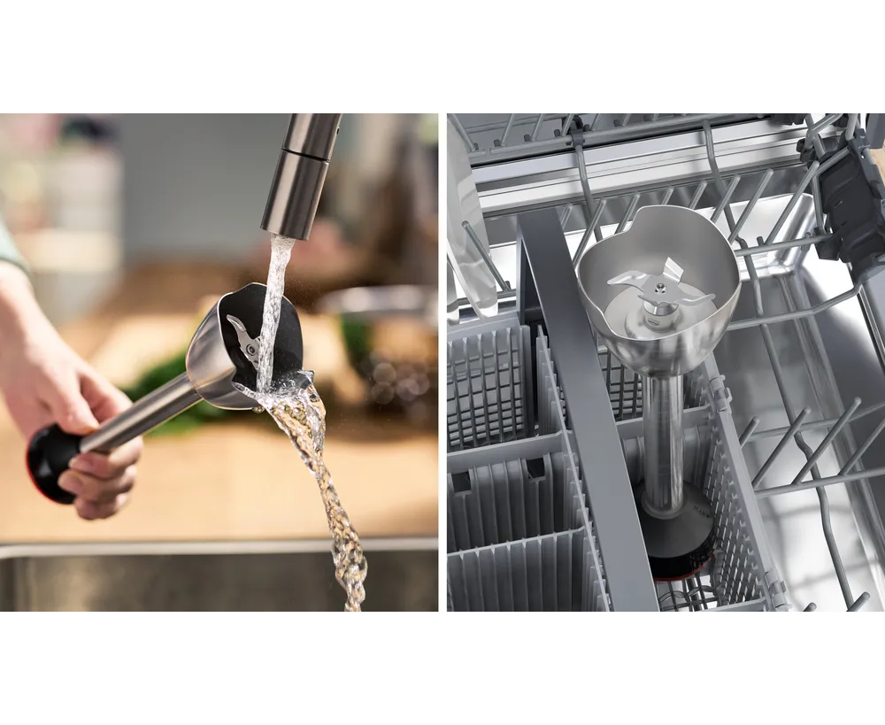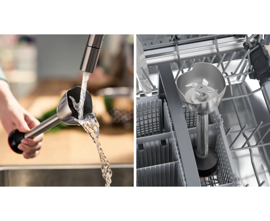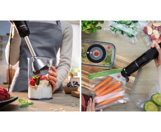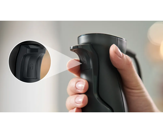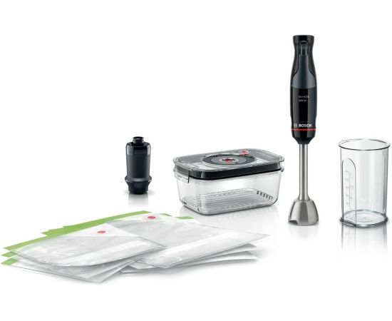 Устройство обладает эргономичной ручкой, которая обеспечивает удобный захват и уверенное управление. Бесступенчатая регулировка скорости позволяет выбирать оптимальный режим для каждого типа продуктов. Импульсный режим обеспечивает мощное и быстрое измельчение даже самых твердых продуктов. В комплекте с блендером поставляется мерный стакан, венчик для взбивания, вакуумный насос, вакуумный контейнер объемом 1.2 литра и вакуумные пакеты с замком. Все детали, подлежащие снятию, можно легко и быстро очистить в посудомоечной машине. Мощность блендера составляет 1000 Вт, что обеспечивает эффективное и быстрое измельчение продуктов.