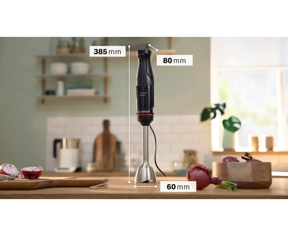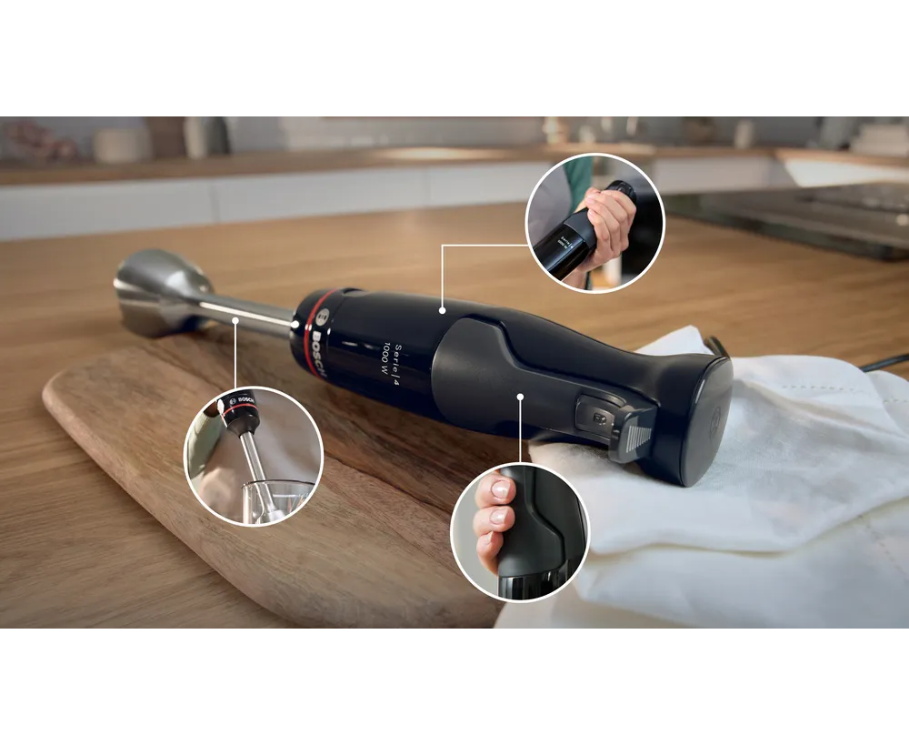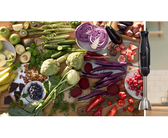 Блендер Bosch MSM4B6V2 из серии MaxoMixx - это высококачественное устройство, созданное для удобства и комфорта при приготовлении различных блюд. Стильный дизайн, выполненный в черном цвете, идеально впишется в любой интерьер кухни. Корпус изготовлен из прочного пластика, а погружная часть - из нержавеющей стали, что обеспечивает долговечность и надежность использования. Блендер оснащен измельчителем, чаша которого выполнена из пластика. Нож блендера с 4 лезвиями QuattroBlade гарантирует равномерное и быстрое измельчение продуктов. Управление блендером происходит с помощью кнопок, что делает его использование максимально удобным и простым.