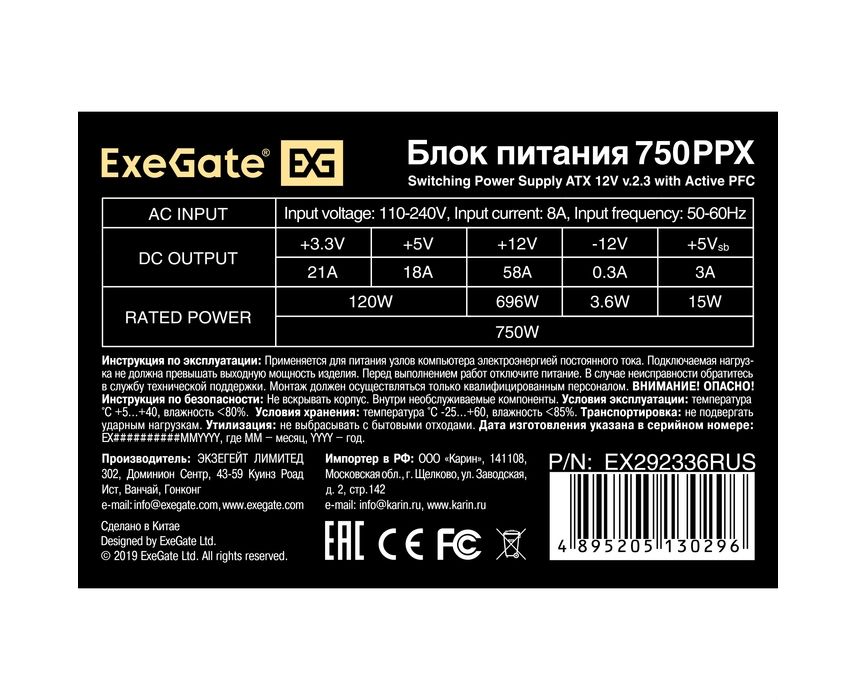 Блок питания ExeGate 750PPX EX292336RUS 750W (ATX, APFC, КПД 80 (80 Plus)