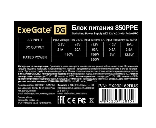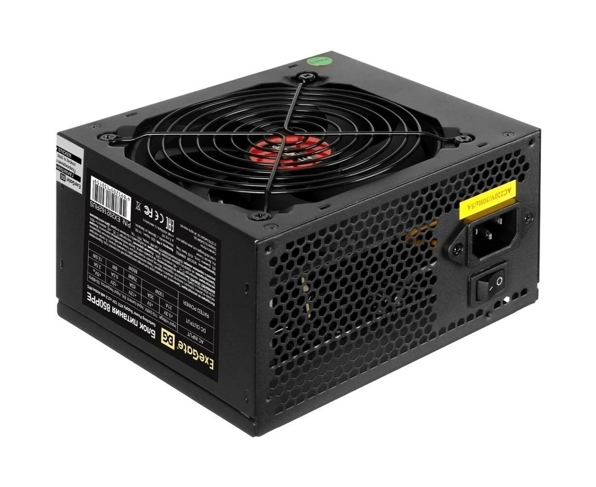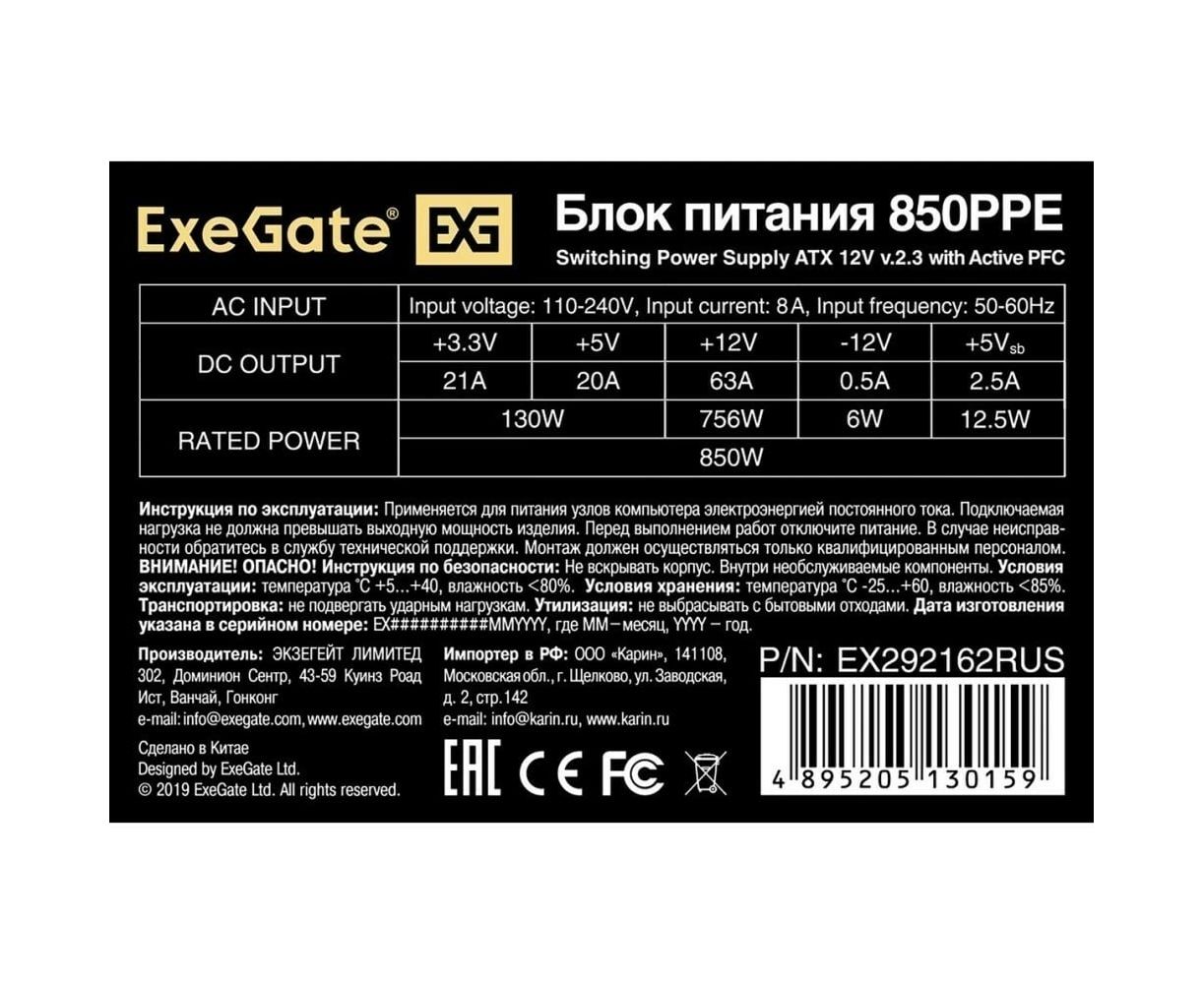 Блок питания ExeGate 850PPE EX292162RUS 850W ATX, APFC, КПД 80 (80 Plus), 12cm fan, 24pin, (4+4)pin, PCIe, 5xSATA, 3xIDE, FDD, black
