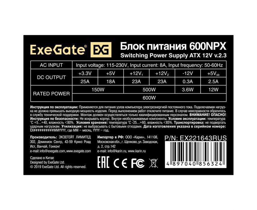 Блок питания ExeGate EX221643RUS 600W 600NPX, ATX, black, 12cm fan, 24p+4p, 6/8p PCI-E, 3xSATA, 2xIDE, FDD