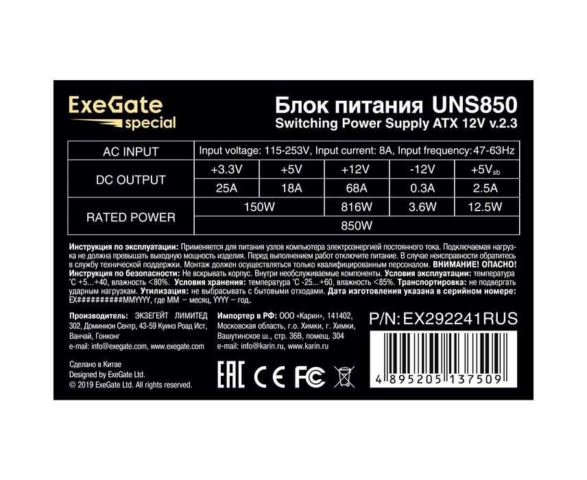 Блок питания ExeGate UNS850 EX292241RUS 850W (ATX, 12cm fan, 24pin, 2x(4+4)pin, 2xPCI-E, 5xSATA, 3xIDE)