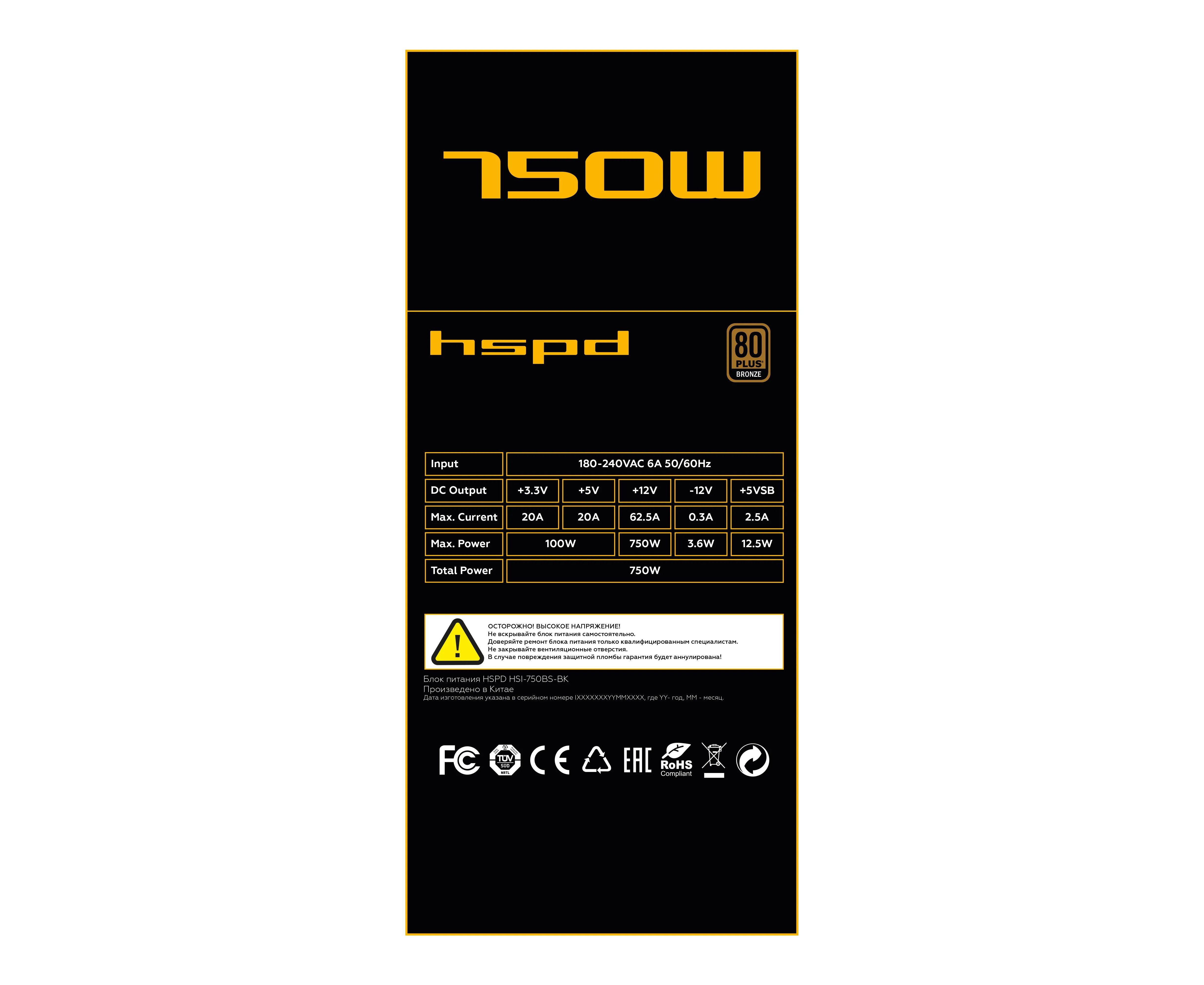 Блок питания HSPD HSI-750BS-BK 750W 80+ Bronze (ATX, 2.31, Semi-modular, 1x24(20+4)pin 550mm, 1xCPU*2 8(4+4)pin 600+150mm, 1xPCIe*2