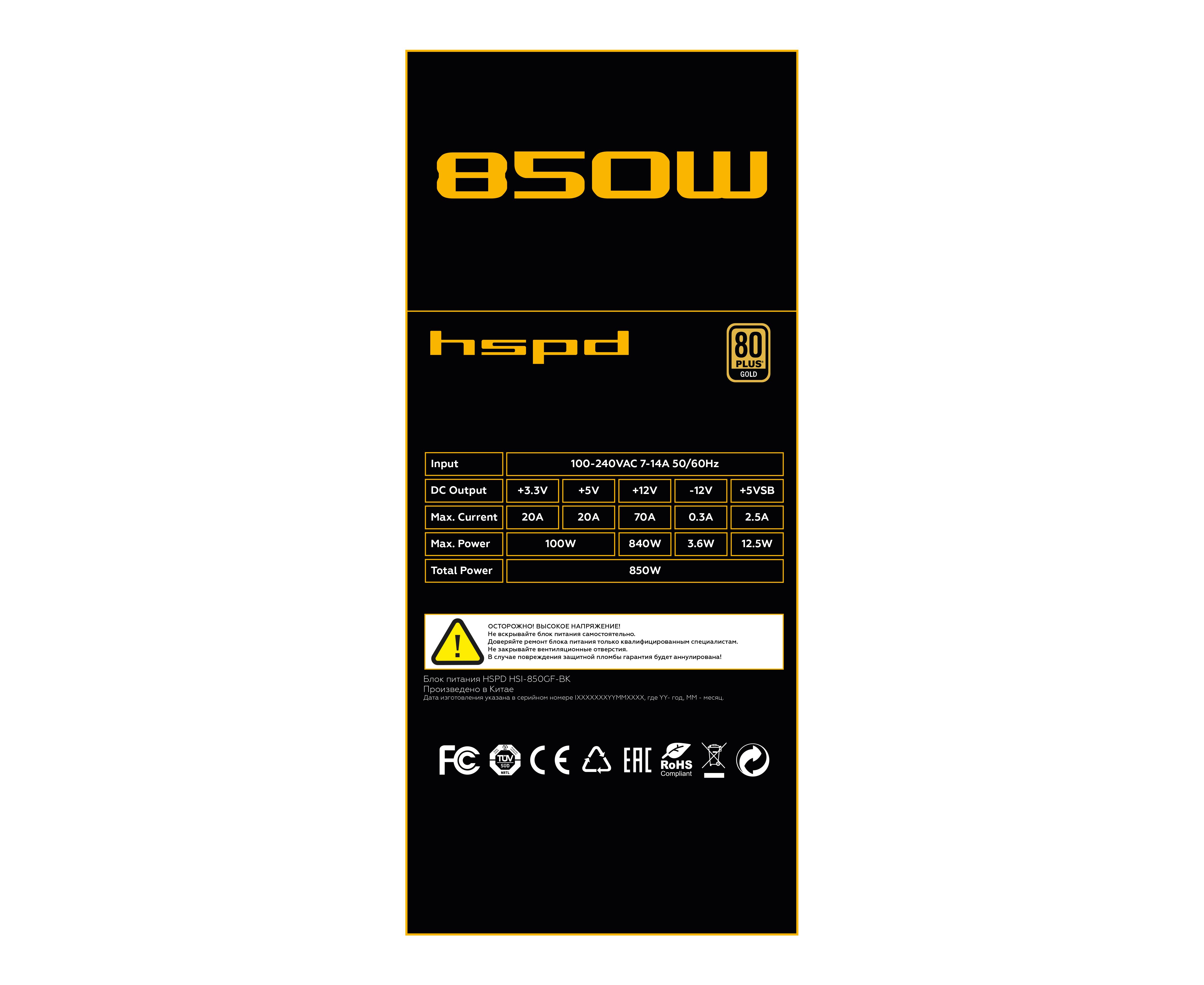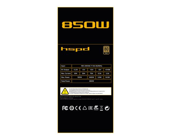 Блок питания HSPD HSI-850GF-BK 850W 80+ Gold (ATX, 3.1, PCIe 5.1, Full modular, 1x24(20+4)pin 600mm, 2xCPU 8(4+4)pin 700mm, 2xPCIe*2