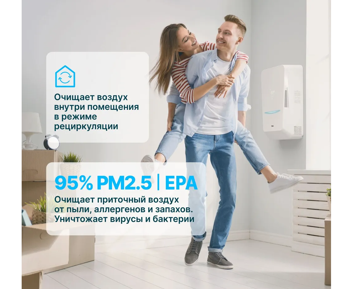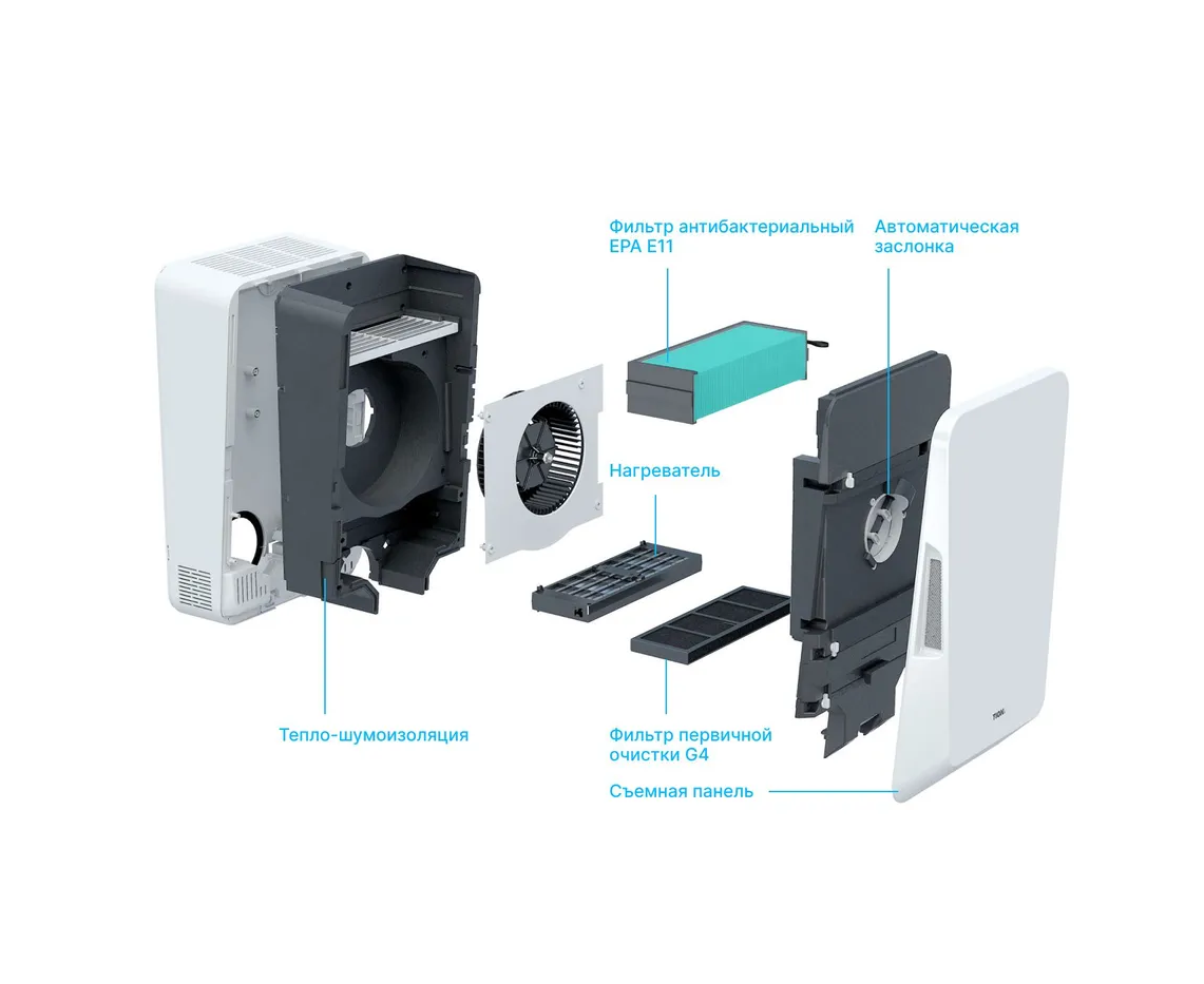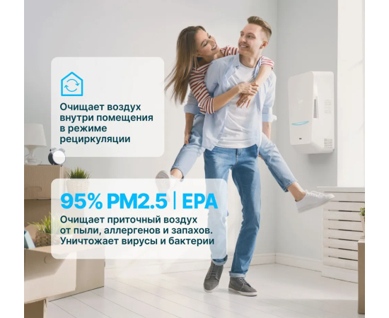 Устройство забирает воздух с улицы, подогревает, пропускает через систему фильтров грубой и тонкой очистки, освобождая от загрязнений, пыли, тонкодисперсных частиц PM2.5, тополиного пуха, пыльцы, спор плесени. Уничтожает вирусы и бактерии на фильтре класса EPA. В помещение поступает чистый свежий воздух комфортной температуры, а в режиме рециркуляции бризер эффективно очистит воздух внутри вашего дома или офиса.