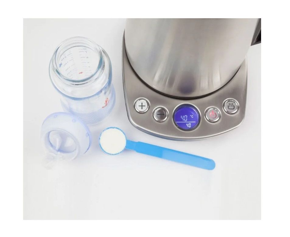Большие удобные кнопки на панели управления. Цифровой дисплей отображает температуру воды. Можно настроить температуру нагрева воды от 40 до 100 °С (шаг 10°С), такая настройка поможет подогреть воду как раз подходящую для приготовления детского питания или конкретного вида чая. По достижении заданной температуры чайник отключится автоматически. С функцией поддержки тепла установленная температура будет сохраняться в течение 2 часов. При падении температуры на 5 °С включается нагревательный элемент.Базовая подставка оснащена противоскользящими ножками. Имеется отсек для намотки электрического шнура.