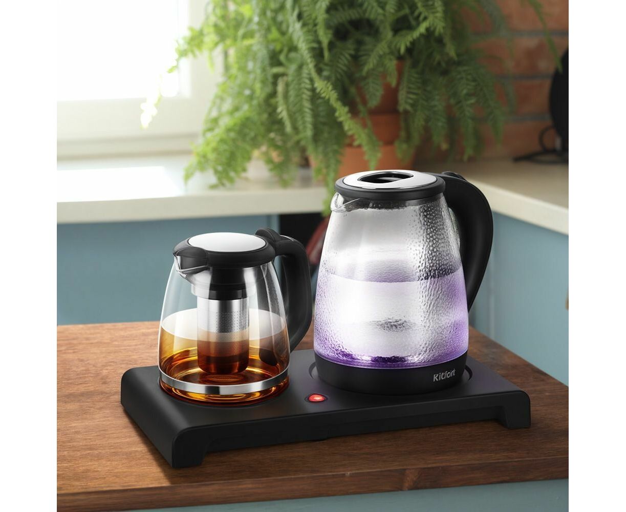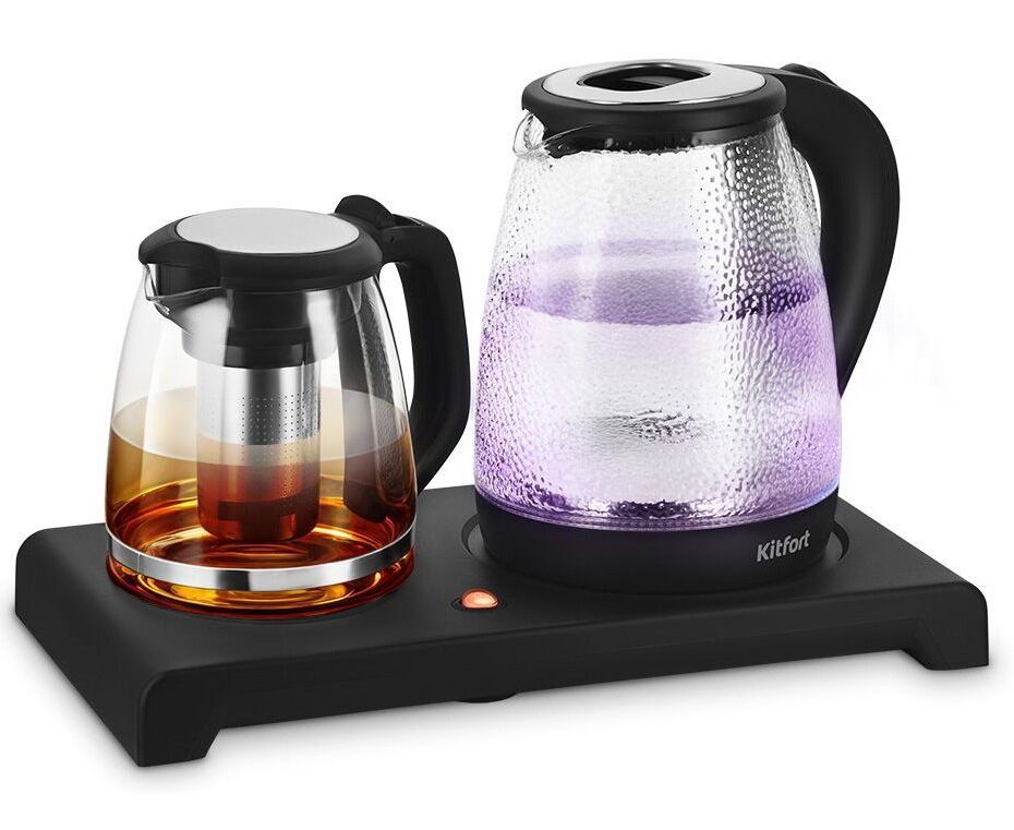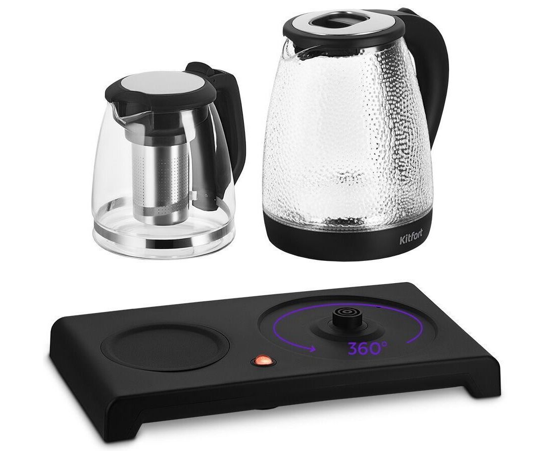 Чайный набор КТ-6734 состоит из чайника ёмкостью 2 л, заварочного чайника с фильтром ёмкостью 1,2 л и базы. Набор поможет вам не только вскипятить воду, но и заварить чай или кофе, а также сохранить готовый напиток тёплым.