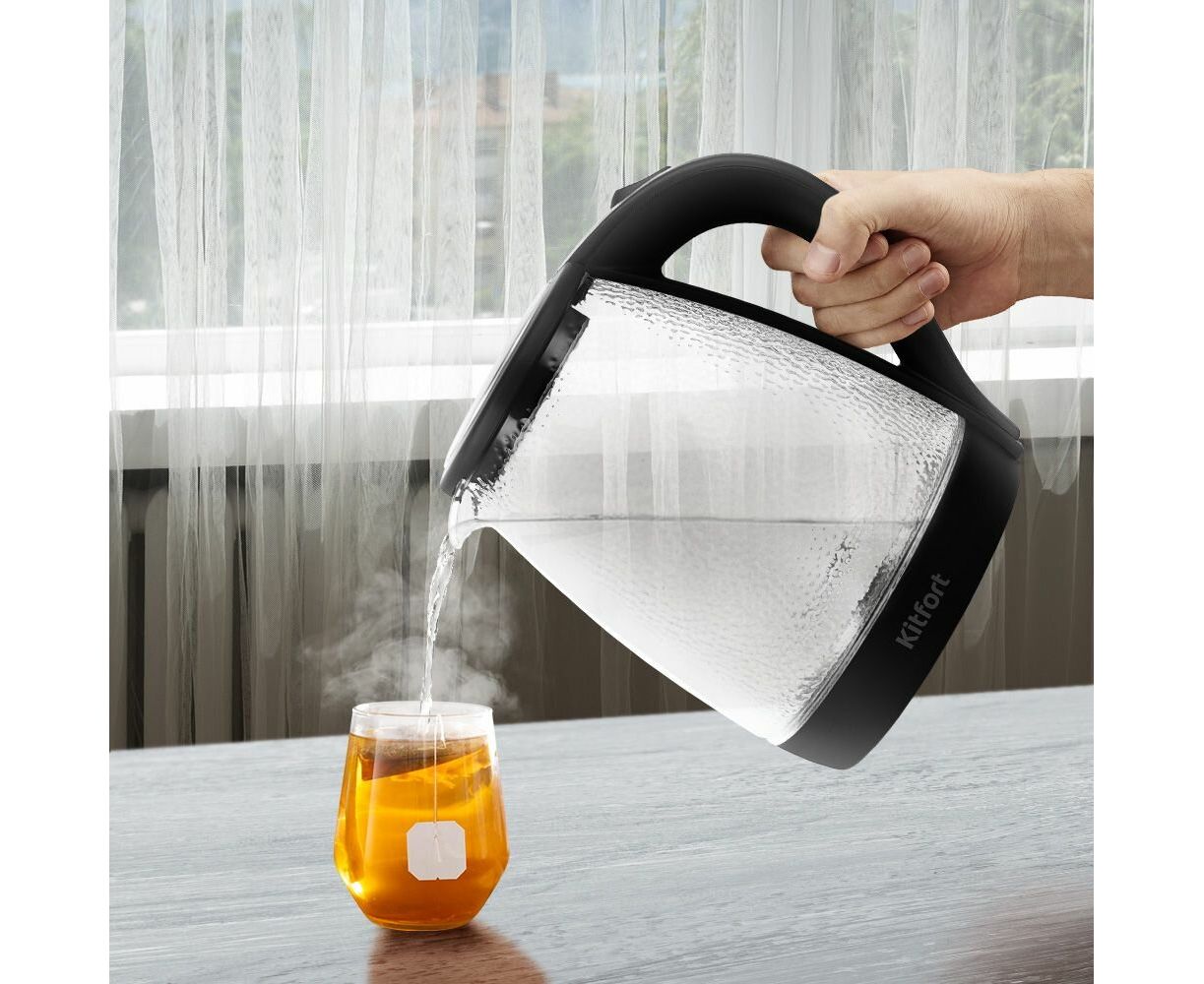 Корпус чайника выполнен из стекла и пластика, а крышка — из пластика и нержавеющей стали. Пластиковая ручка чайника позволяет удобно держать его в руке: ручка не скользит и не нагревается благодаря особенностям конструкции.