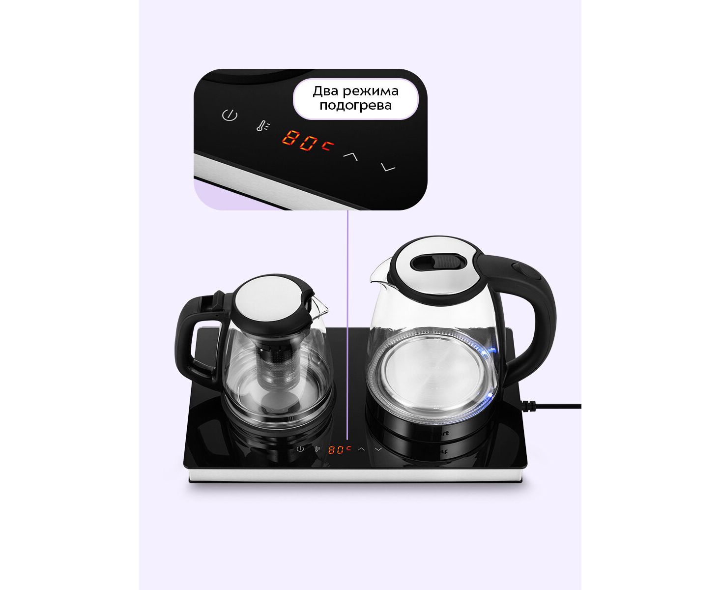 Чайный набор КТ-6737 оснащён двумя режимами работы − «Чай» или «Кофе». В режиме «Чай» можно установить температуру платформы с подогревом от 75 до 85°С (по умолчанию выбрано 80 °С), в режиме «Кофе» – от 60 до 80 °С. Шаг установки составляет 1°С.