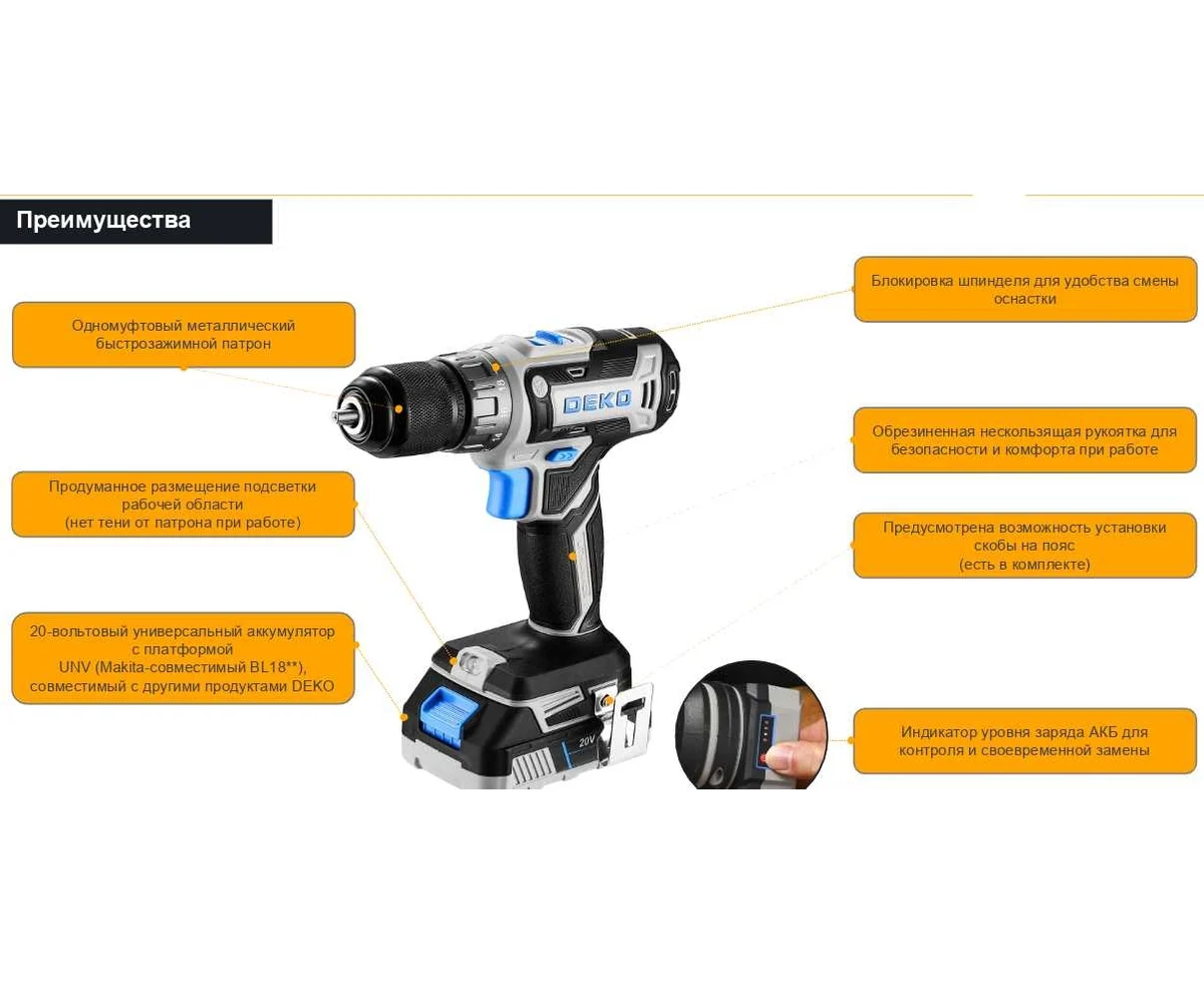 Дрель-шуруповерт аккумуляторный Deko Loner 20V 085-1005