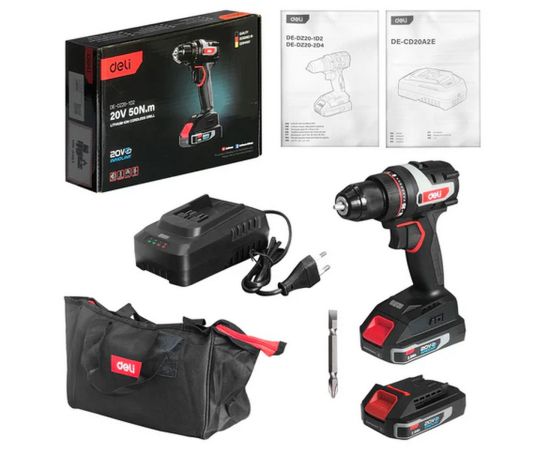 Дрель-шуруповерт Deli DE-DZ20-1D2 (2 АКБ*2Ач+ЗУ, 20В, 10мм, 50Нм, сумка)