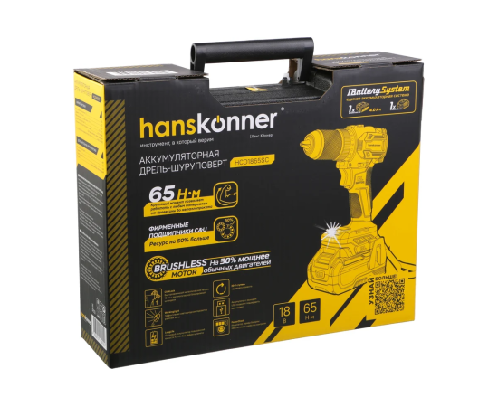 Дрель-шуруповерт Hanskonner HCD1865SC б/щ, 18В, 1BatterySystem, 65Нм, 1х4Ач, 13мм, кейс