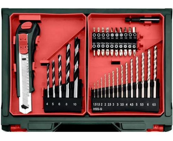 Дрель-шуруповерт, быстрозажимной сверлильный патрон, крючок для ношения на ремне, 2 АКБ по 2 А*ч, зарядное устройство LC 24, пластиковый кейс, комплект принадлежностей (наборы бит и сверл).