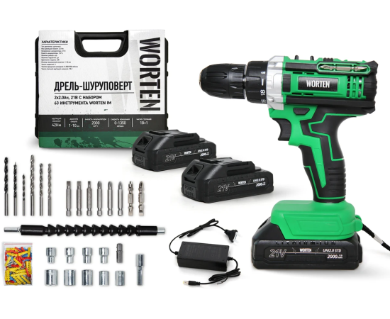 Дрель-шуруповерт WORTEN IM КА-90000574 2x2.0Ач+ЗУ, 21В с набором 63 инструмента