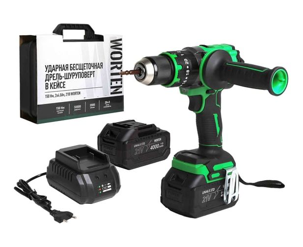 Дрель-шуруповерт WORTEN КА-90000703 ударная бесщеточная в кейсе 150 Нм, 2х4.0Ач+ЗУ, 21В