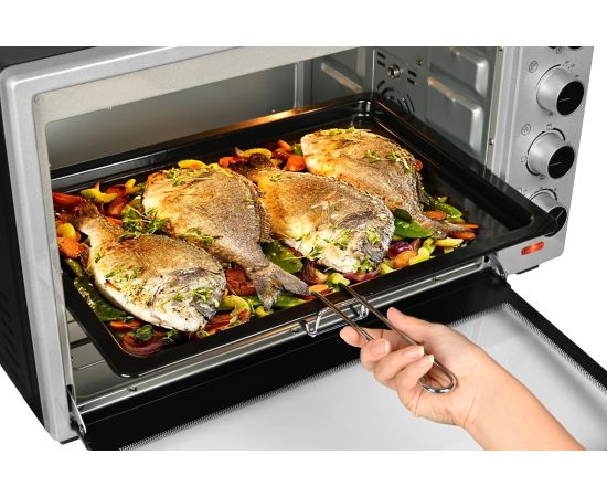 Мини-печь Gfgril GFO-60 мощностью 2000 Вт легко заменит духовку. В комплекте идут ухват, вертел, подставка для пиццы, решетка, плоский противень. Есть режимы конвекции и гриля.