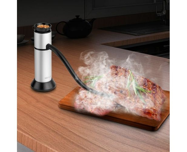 Пригоден для использования в помещении - дымогенератор устойчиво стоит на столе, а эластичная коптильная трубка длиной 25 см позволяет окуривать продукты в любой посуде