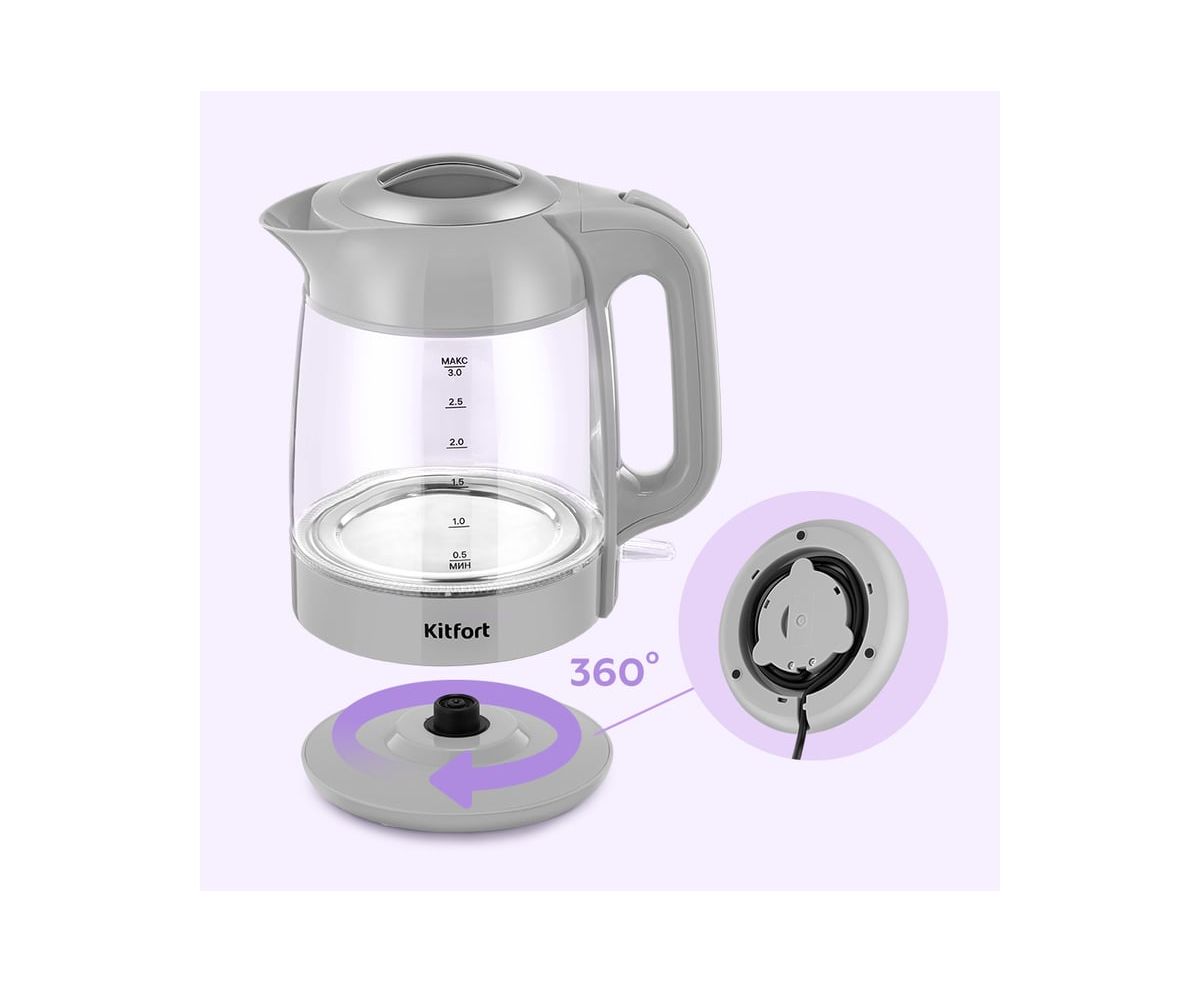 Электрический чайник Kitfort КТ-6766 предназначен для кипячения воды дома, в офисе, на даче. Ёмкость чайника 3 литра — этого хватит, чтобы приготовить горячие напитки на большую семью. Полный чайник закипает за 9 минут.