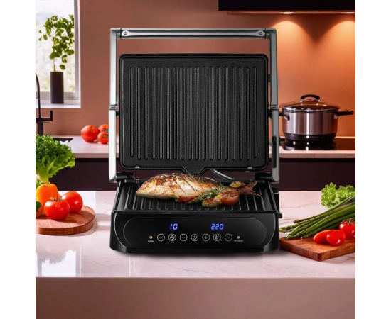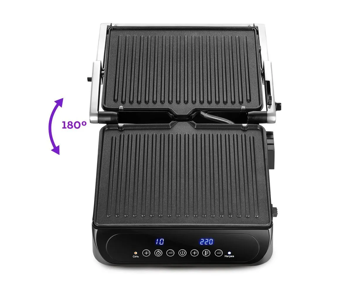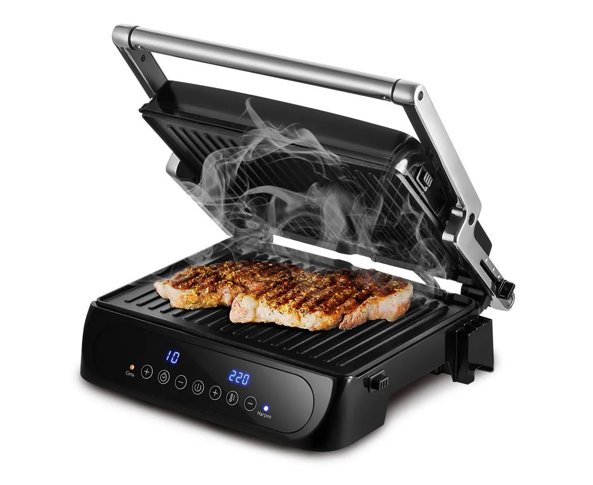 Электрогриль позволяет регулировать время и температуру приготовления, а также гриль оснащён дисплеем и термостатом для поддержания температуры панелей.