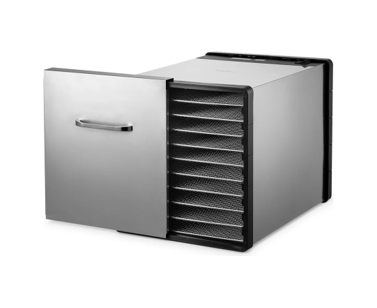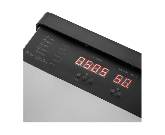 Технические характеристики Тип электрическая Управление электронное Мощность 630 Вт Материал корпуса нержавеющая сталь Размеры поддона 295х365 мм Количество режимов работы 6 Количество секций 10 Регулировка высоты поддонов нет Таймер есть Дисплей да Min температура 30 °С Max температура 70 °С Регулировка температуры да Max загрузка 8.3 кг Приготовление пастилы нет Приготовление йогурта нет Для овощей да Для фруктов да Для ягод да Для грибов да Для трав да Для мяса да Цвет металлик Встроенный вентилятор есть Направление подачи воздуха горизонтально Габариты без упаковки 475х330х327 мм Вес нетто 11 кг Материал поддона нержавеющая сталь