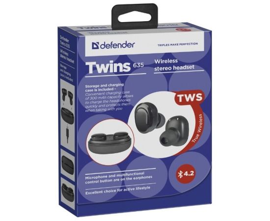 Беспроводная гарнитура DEFENDER Twins 638 черный,TWS, Bluetooth 63638