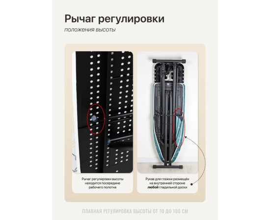 Подходит для правшей и левшей. Доску можно плавно регулировать по высоте. Регулируемые опоры служат для устойчивости доски на неровном полу.