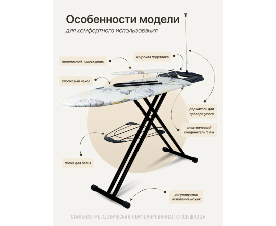 Широкая гладильная доска предназначена для глажки белья. Модель оснащена электросоединителем и эргономичной подставкой под утюг.