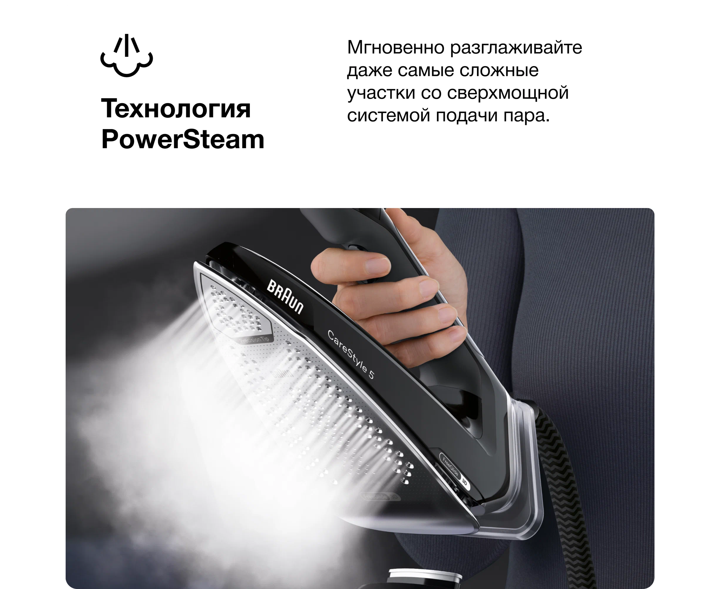 Этот эргономичный утюг может похвастаться уникальной открытой с обратной стороны и мягкой текстурированной ручкой, поэтому вы будете наслаждаться свободой движений во время длительных сеансов глажки. Режим Smart iCare защищает вашу одежду при безопасной температуре для всех видов тканей, которые можно гладить, — для интеллектуальной защиты текстиля.
