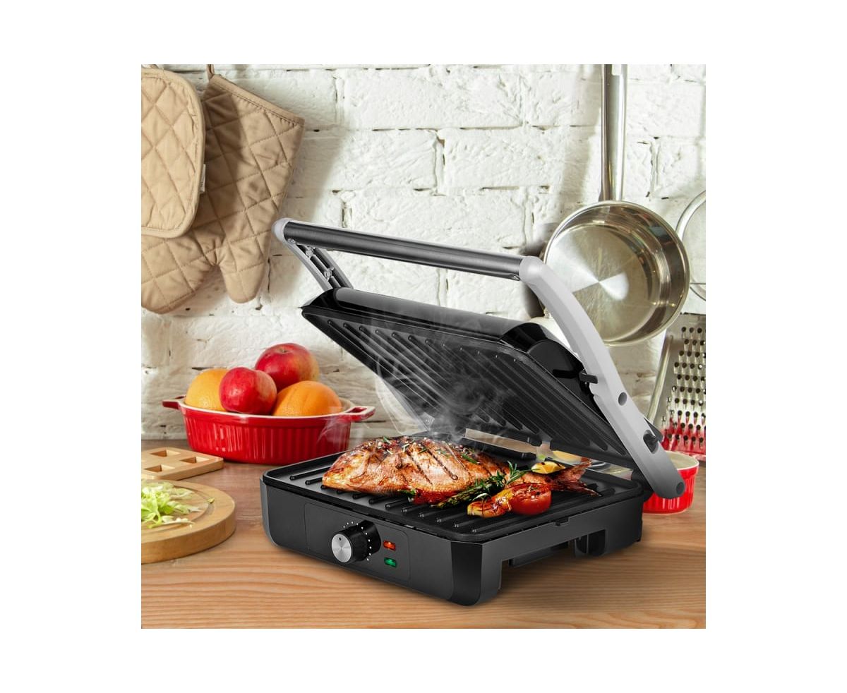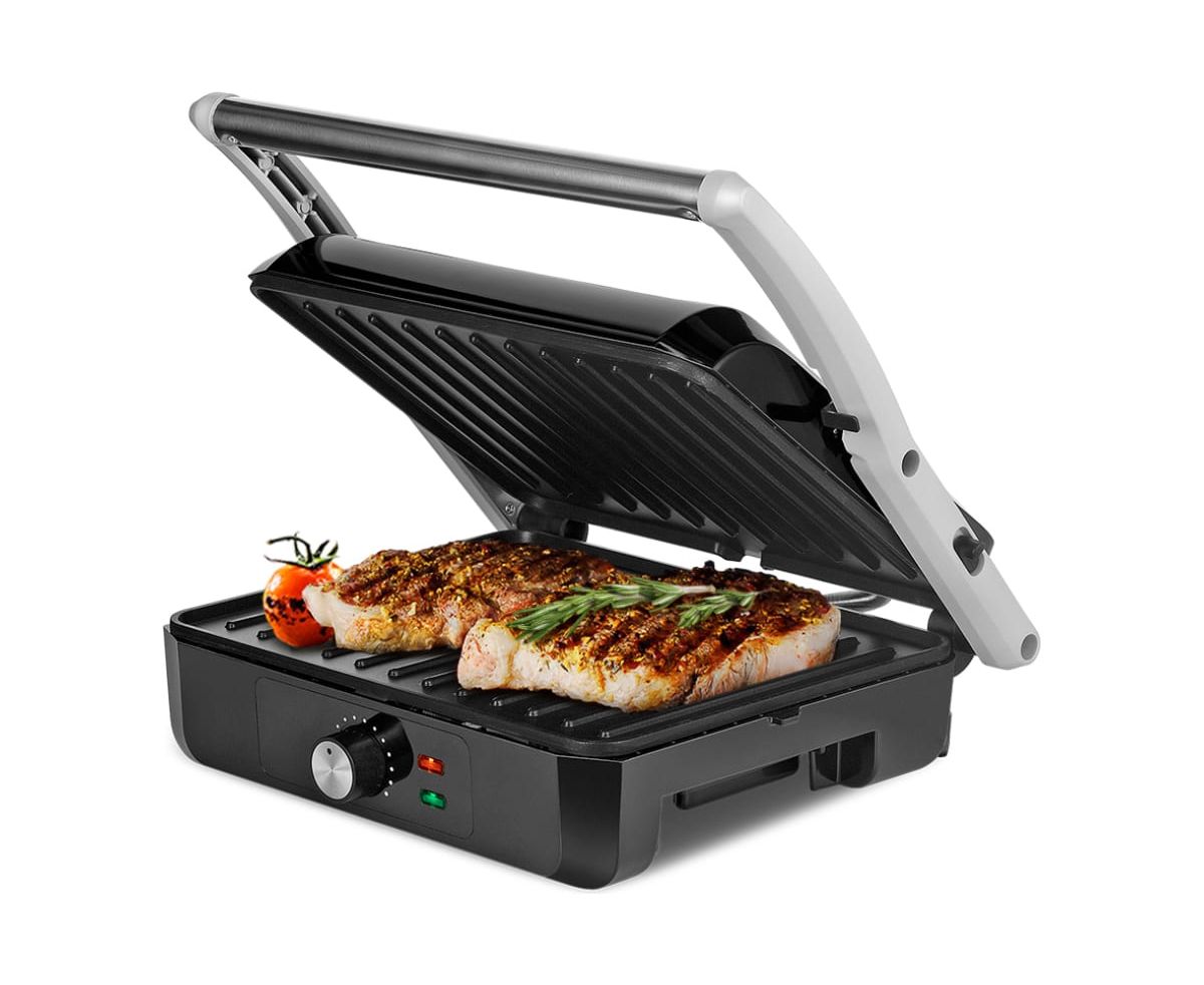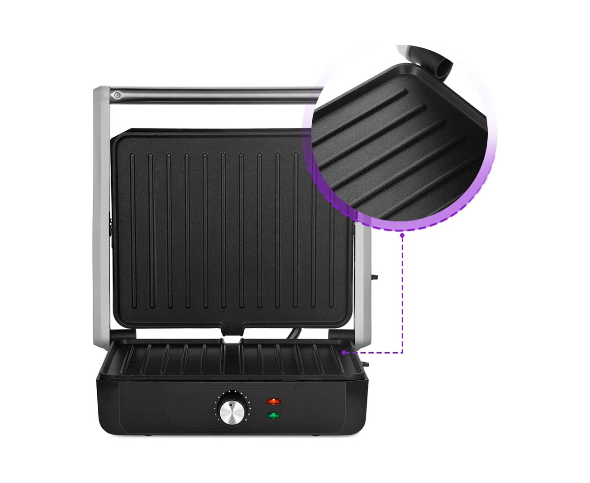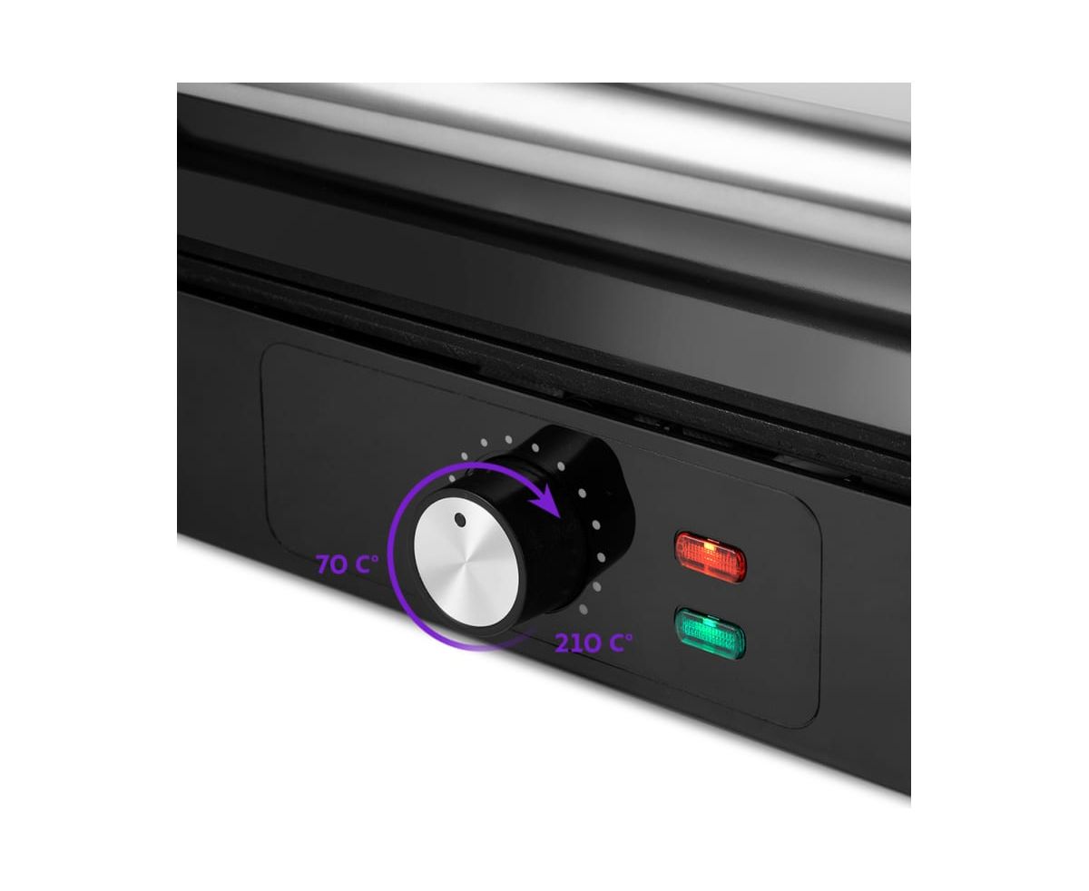 Гриль оснащен термостатом для поддержания температуры панелей, а также индикаторами питания и нагрева. С помощью регулятора температуры вы сможете плавно менять температуру приготовления.