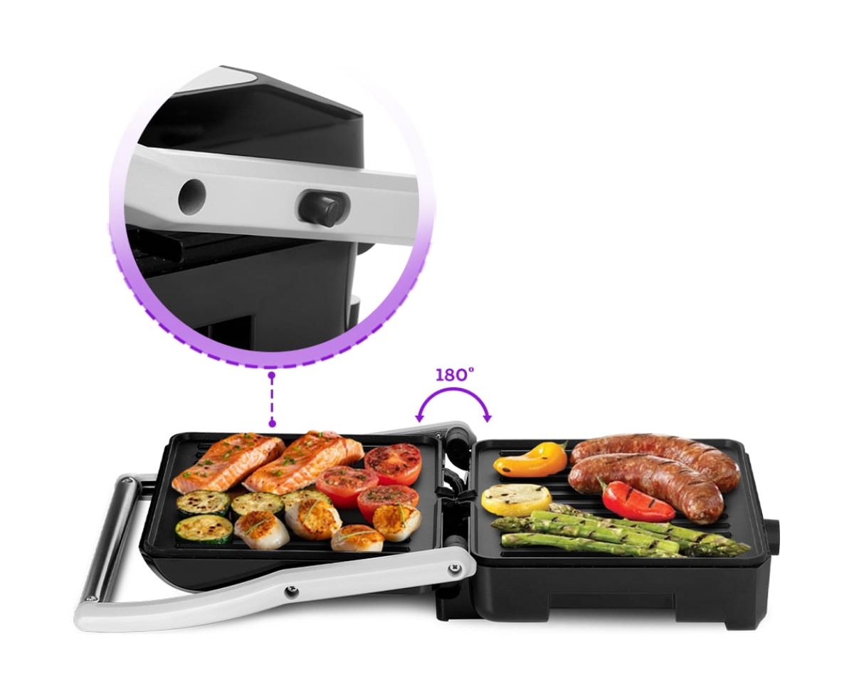 Конструкция гриля позволяет готовить в двух режимах: двустороннем и одностороннем. В двустороннем режиме электрогриль закрывается крышкой, так что продукты находятся между двух нагреваемых панелей и готовятся с двух сторон сразу. Такой способ позволяет сократить время готовки, а также не требует переворачивания продуктов во время приготовления. В одностороннем режиме крышка гриля откидывается на 180°, благодаря чему гриль превращается в большую жаровню, а продукты можно выложить сразу на две панели.