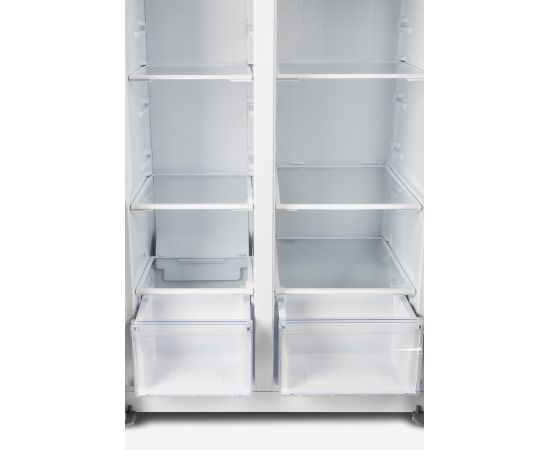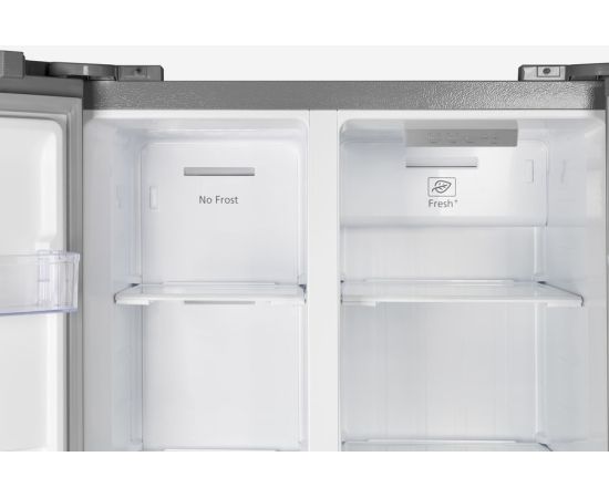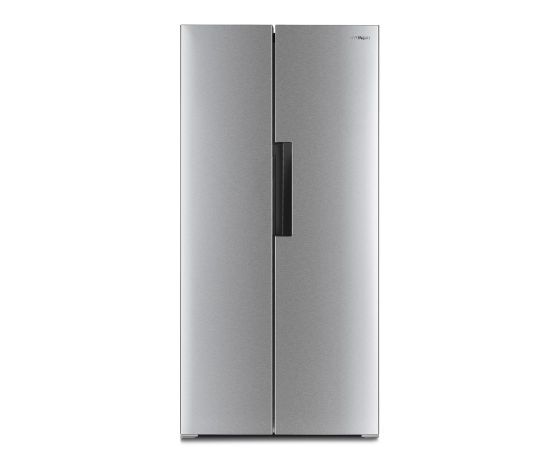 количество камер: двухкамерный; расположение морозильной камеры- сбоку (Side by Side), размораживание морозильной камеры- Total No Frost, общий объем 476л, защита от детей, цвет: нержавеющая сталь