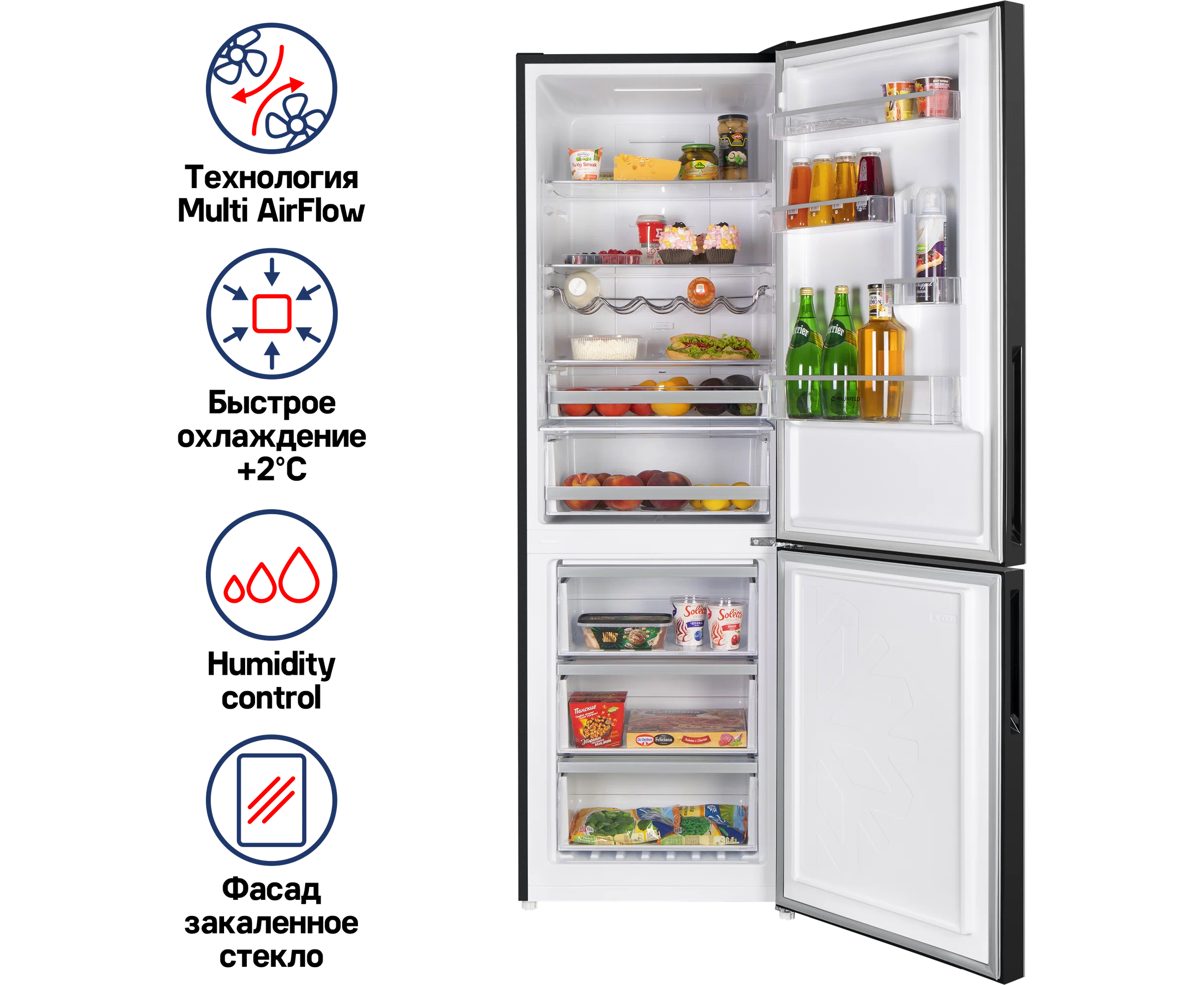 индикация температуры, система контроля влажности, Full No Frost, Антибактериальное покрытие камеры, Светодиодная подсветка, Скрытые ручки, Суперзаморозка