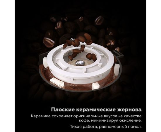 ■ Кофемолка с керамическими жерновами обеспечивает стабильный и однородный помол, сохраняя уникальный вкус и аромат кофе, не окисляет и не пережигает зерна при длительной работе.