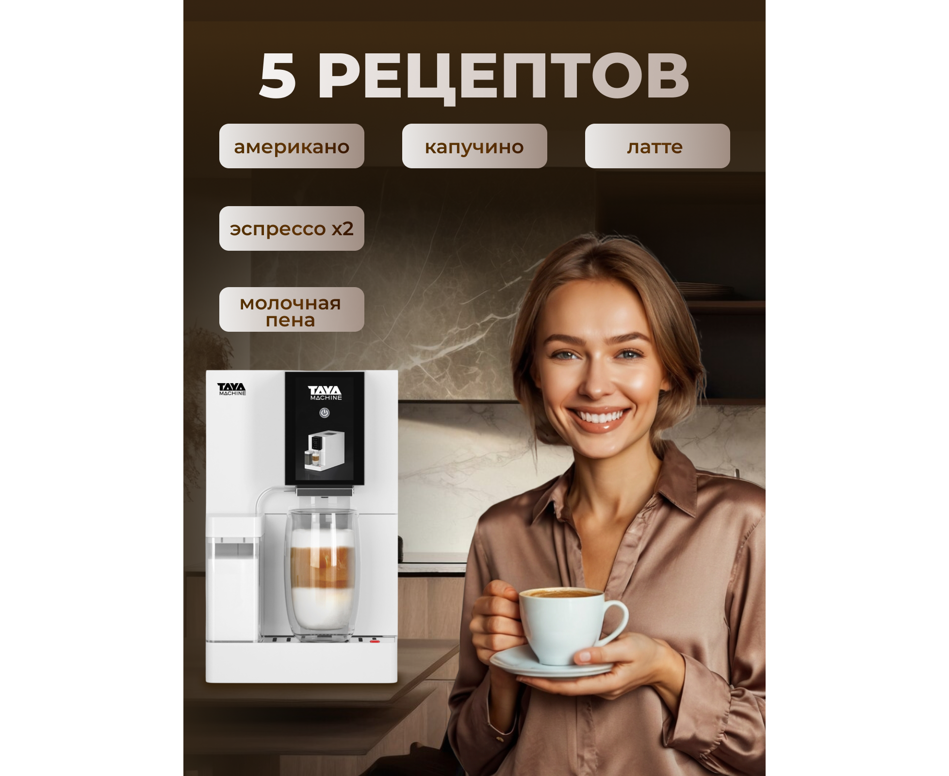 Автоматический капучинатор, позволит вам с легкостью приготовить идеальную плотную молочную пенку для капучино, латте и других напитков с молоком. Выберите объем напитка и сохраните свои предпочтения в памяти кофемашины, чтобы наслаждаться чашкой любого размера, в то время как TAYA machine R5 автоматически приготовит вашу идеальную порцию кофе.