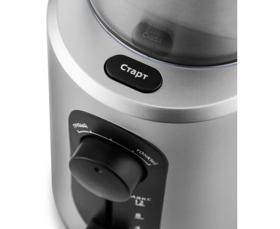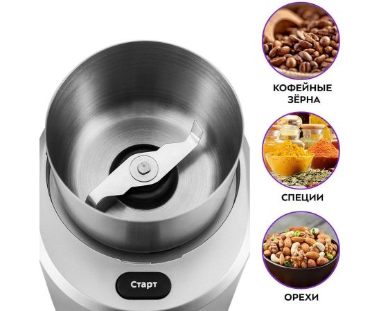 мощность 200Вт; система помола: ротационный нож; вместимость 70г; регулировка степени помола; помол специй; цвет- нержавеющая сталь