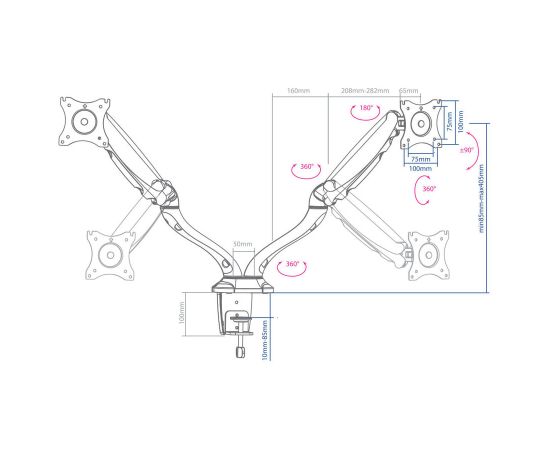 Описание: Независимая регулировка каждого экрана — мониторы на кронштейнах можно поворачивать вокруг совей оси на 360°, наклонять вверх и вниз, придвигать или удалять от себя. Два варианта установки на столешницу: за край стола и на поверхность стола.