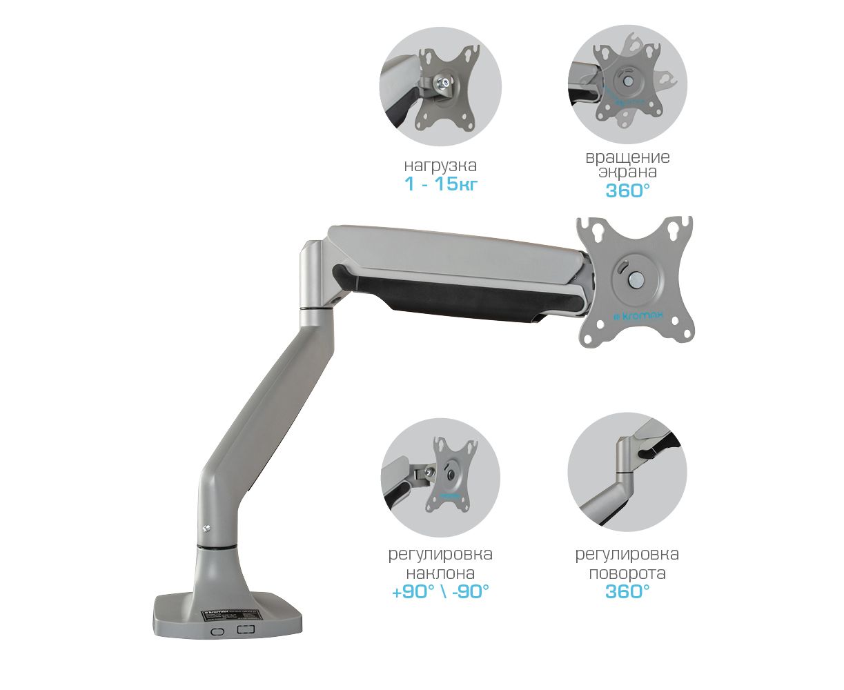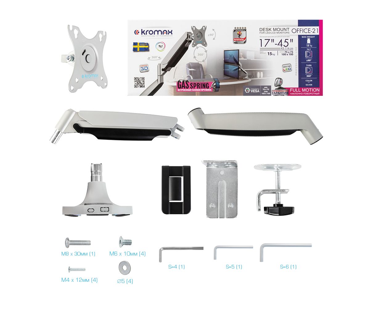 Кронштейн для крепления телевизоров и мониторов KROMAX OFFICE-21 SILVER надёжно удержит экран размером 17"-45" дюйма и весом 1-15 кг. Регулировка позволит вращать экран на 360°, наклонять вверх и вниз на ±90°, и поворачивать влево и вправо на 360° – для оптимального угла зрения и удобной посадки.