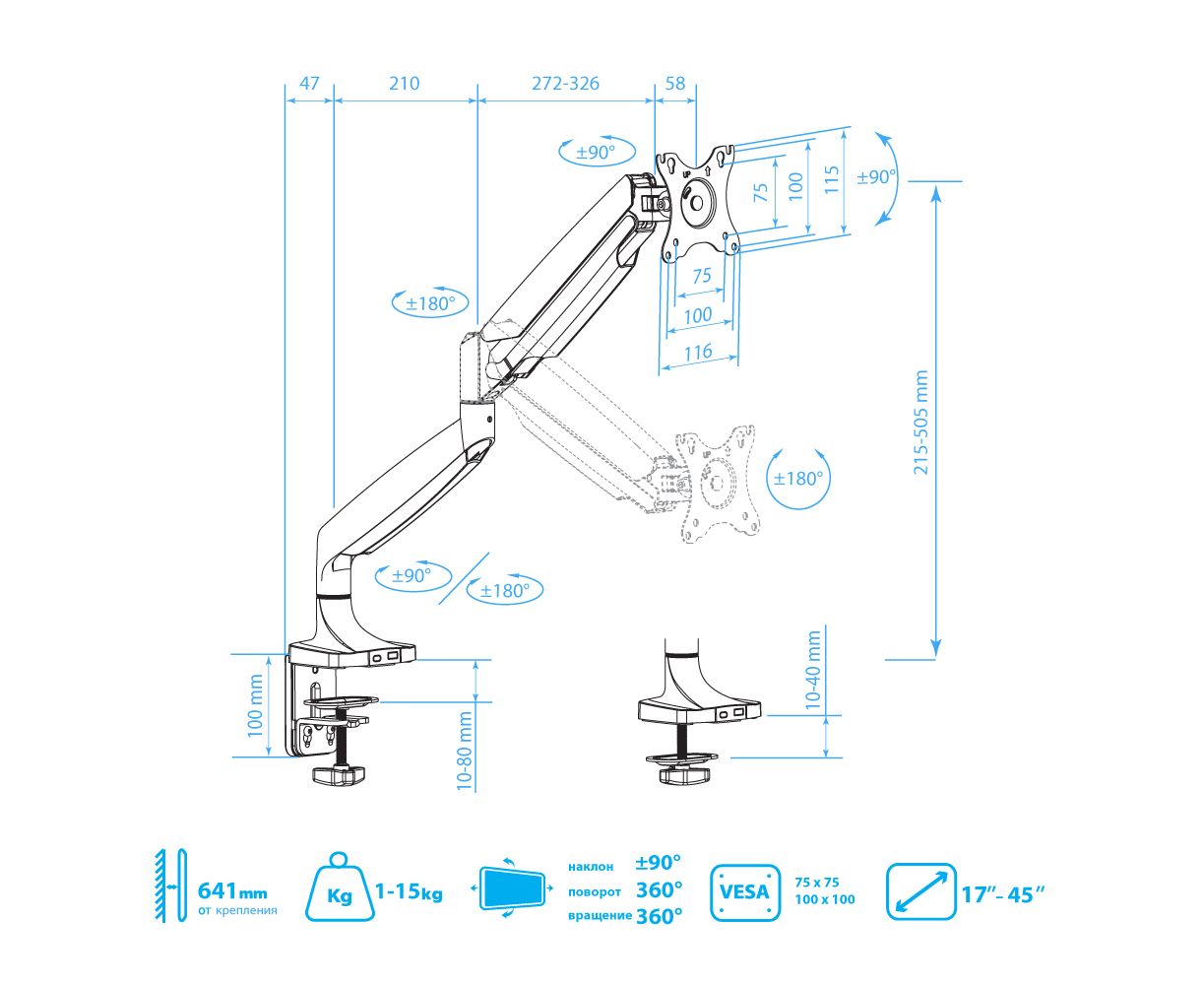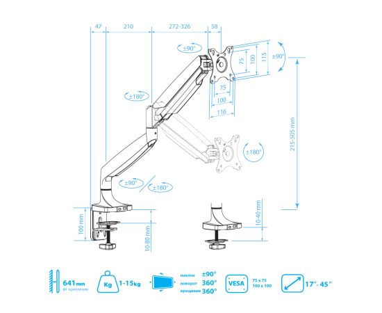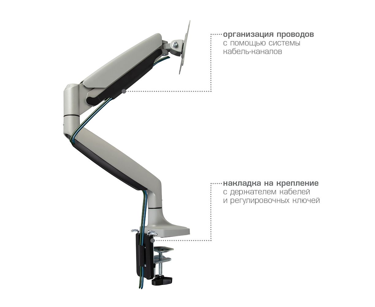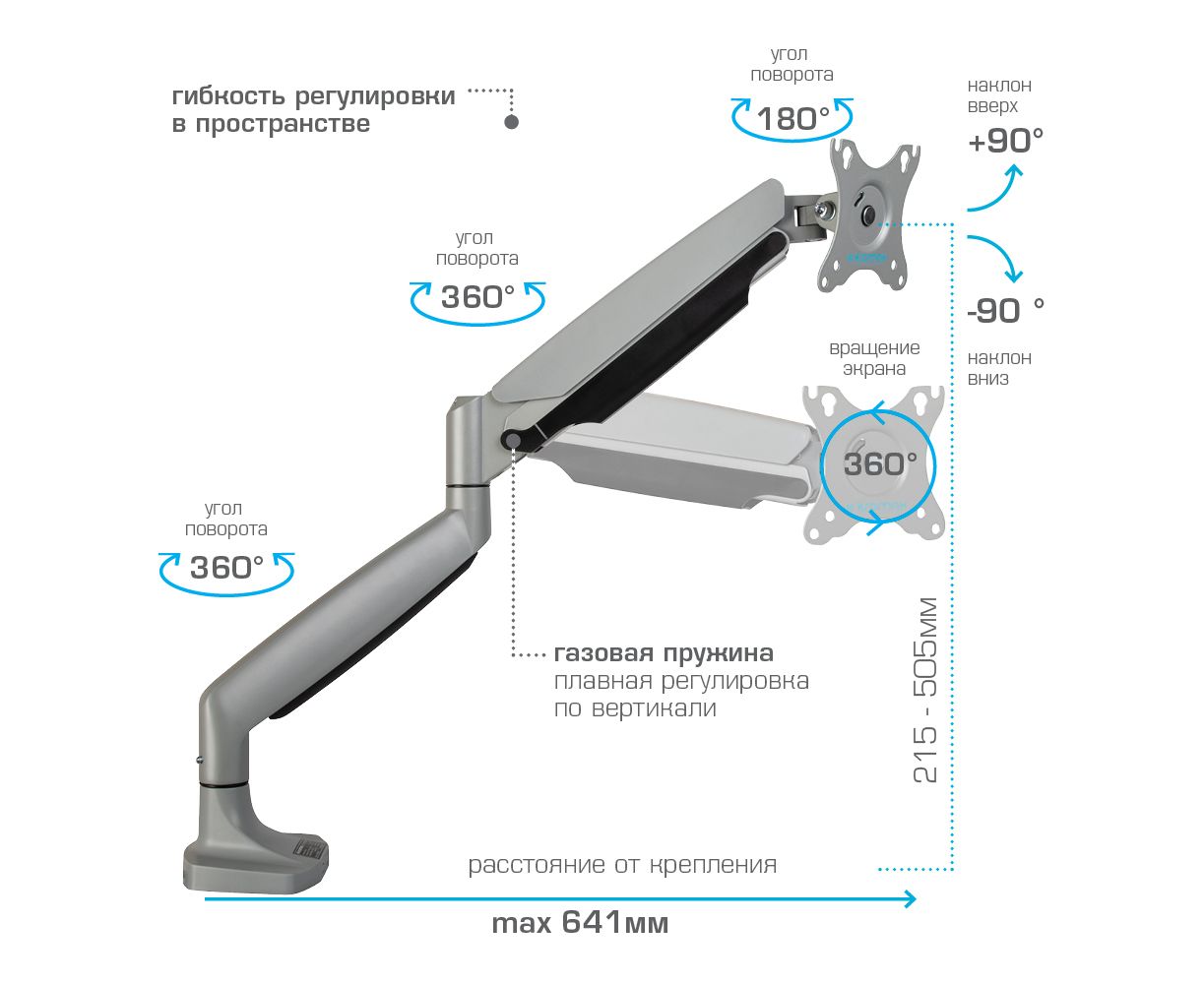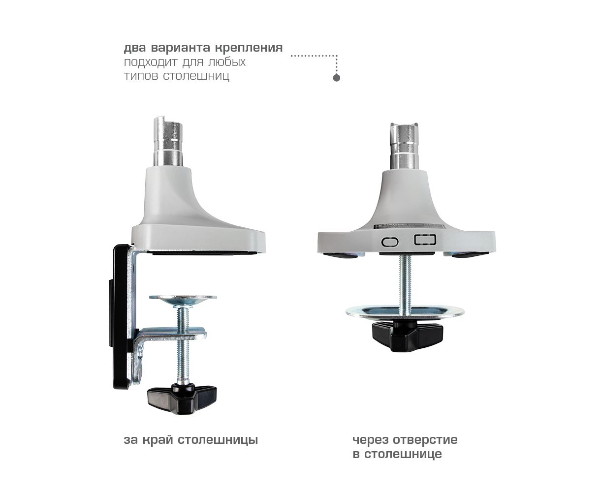 Система легкой регулировки 3D Motion System специальный сферический шарнир позволяет легко и точно регулировать положение мониторов, Вращения экрана на 360° возможность размещения мониторов, как в вертикальном, так и в горизонтальном положении, Вертикальное перемещение в пределах 270 mm, Газовая пружина GAS SPRING Обеспечивает плавное движение монитора вверх и вниз, а так же делает возможность фиксировать монитор в любом промежуточном положении, Два способа крепления к столу