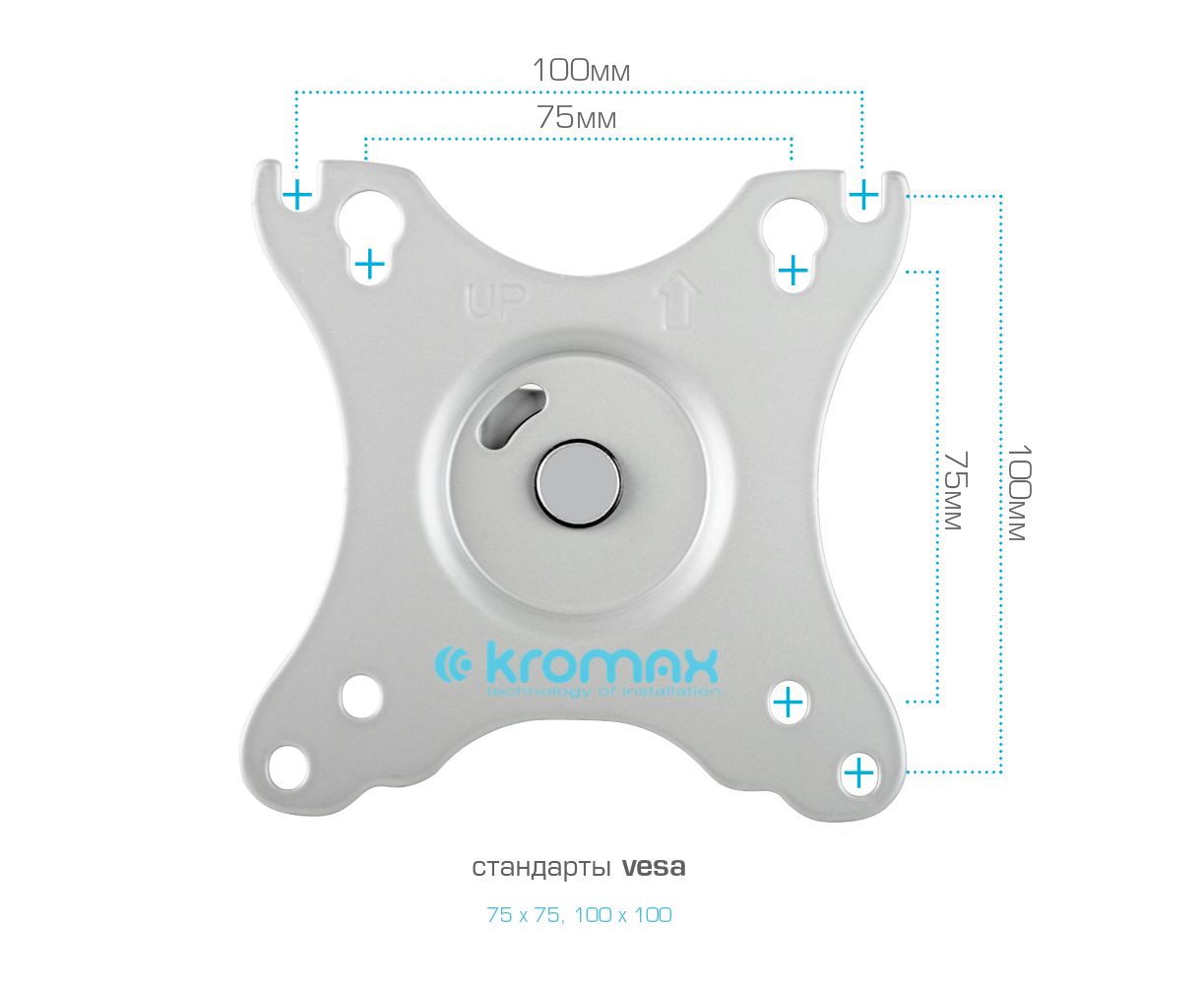 Крепёжные отверстия настольного кронштейна KROMAX OFFICE-21 SILVER изготовлены по международному стандарту VESA.