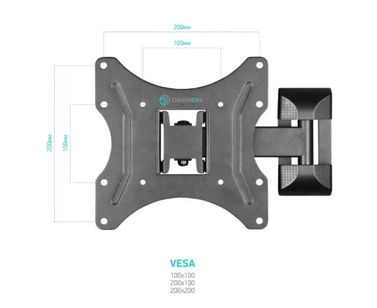 22"-42" Кронштейн ONKRON M2S Наклонно-поворотный, черный, макс. 200*200, 1 колено, наклон -2º+12º, поворот 80º макс от стены 35-205мм