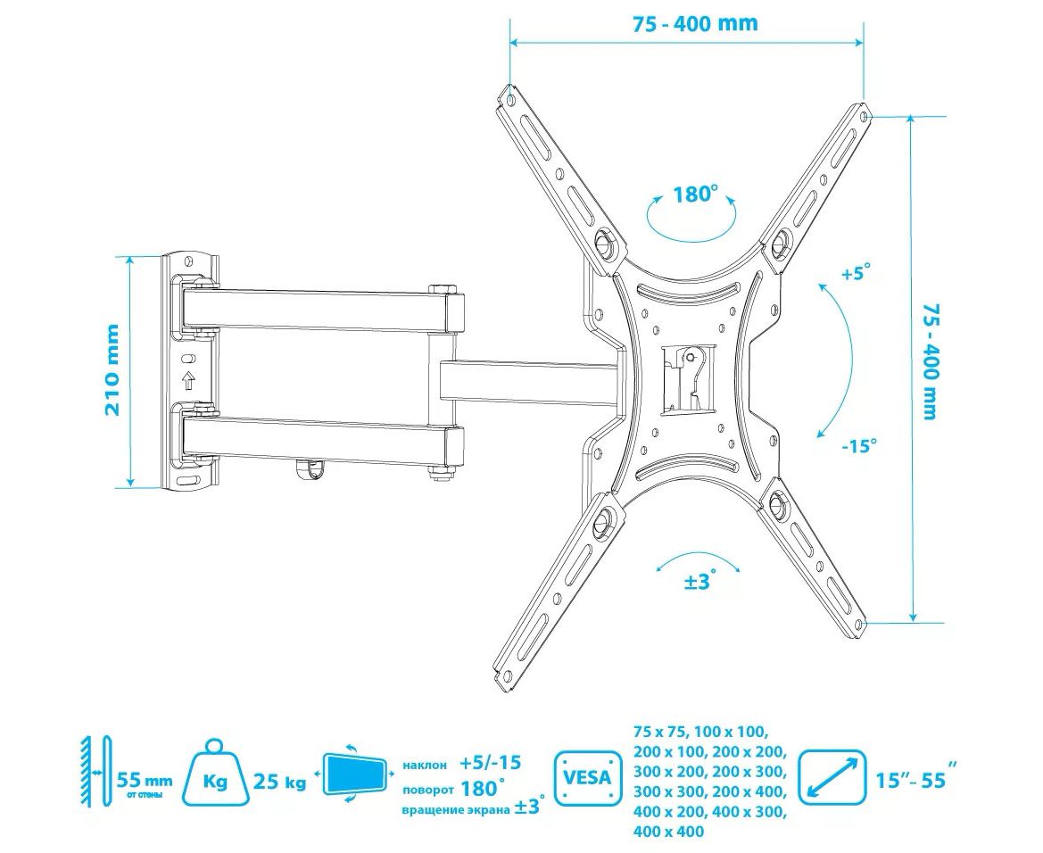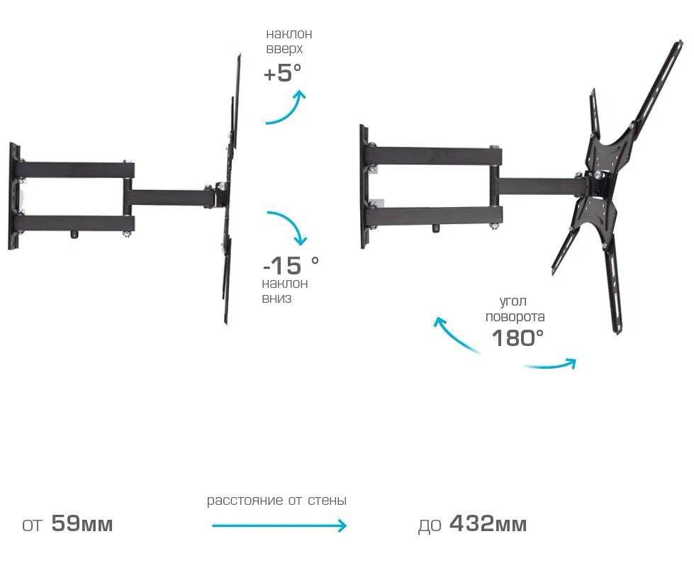 Дополнительная информация: декоративные накладки, кабель-канал; расстояние от стены 59-432 мм; угол наклона +5 -15°; угол поворота 180°; вращение экрана ±3°