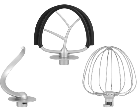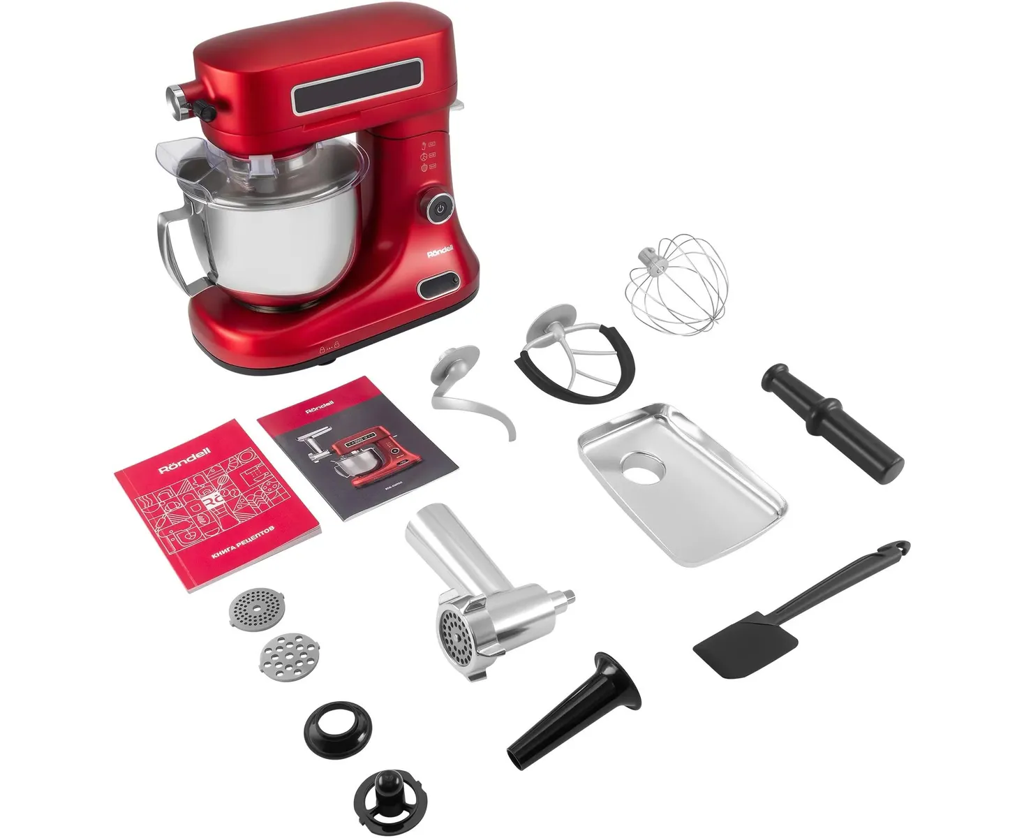 Кухонная машина чаша; защитная крышка; насадка-венчик; насадка-лопатка с гибким ребром; насадка-крюк; насадка-мясорубка; 3 решётки для мясорубки; насадки для колбас и кеббе; кулинарная силиконовая лопатка; книга рецептов; инструкция
