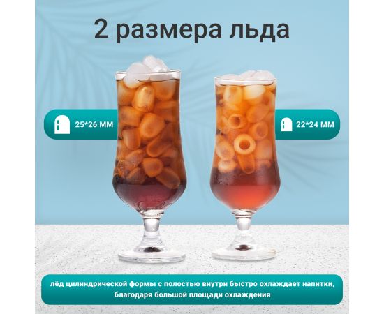 Приготавливаемый генератором пальчиковый лёд достаточно хрупкий, и компактно помещается в стакане, при этом хорошо пропуская жидкость, которую надо охладить. Вы можете выбрать размер кубиков: маленькие пригодятся для подачи свежих морепродуктов, большой размер подойдёт для напитков.