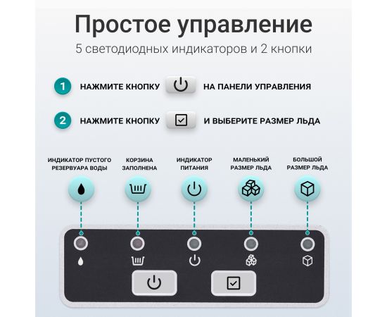 Пользоваться прибором легко: на панели управления расположены кнопки, а также индикаторы выбранного размера льда, питания и заполнения корзины.