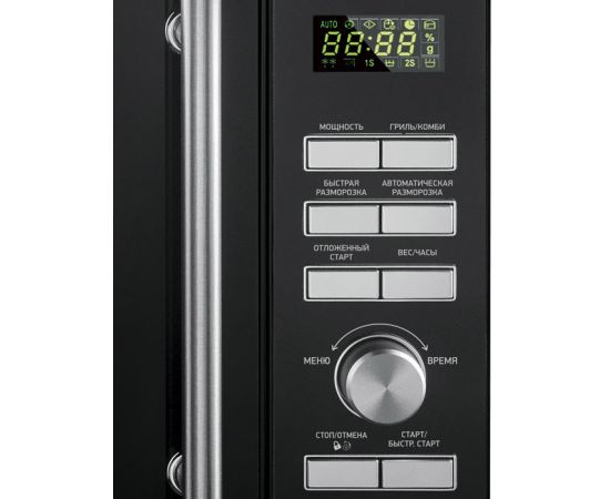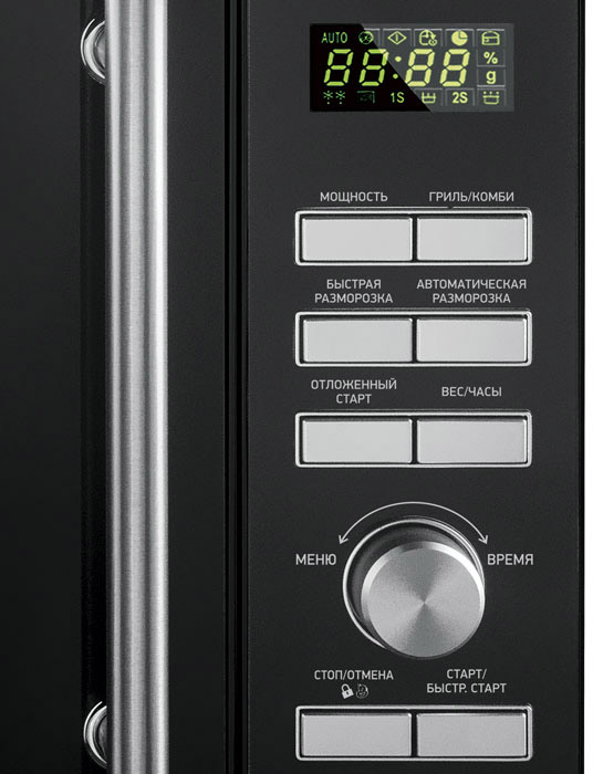 отдельно стоящая микроволновая печь, объем 25 л, мощность 900 Вт, гриль, электронное управление, тактовое и кнопочное управление, дисплей, защита от детей