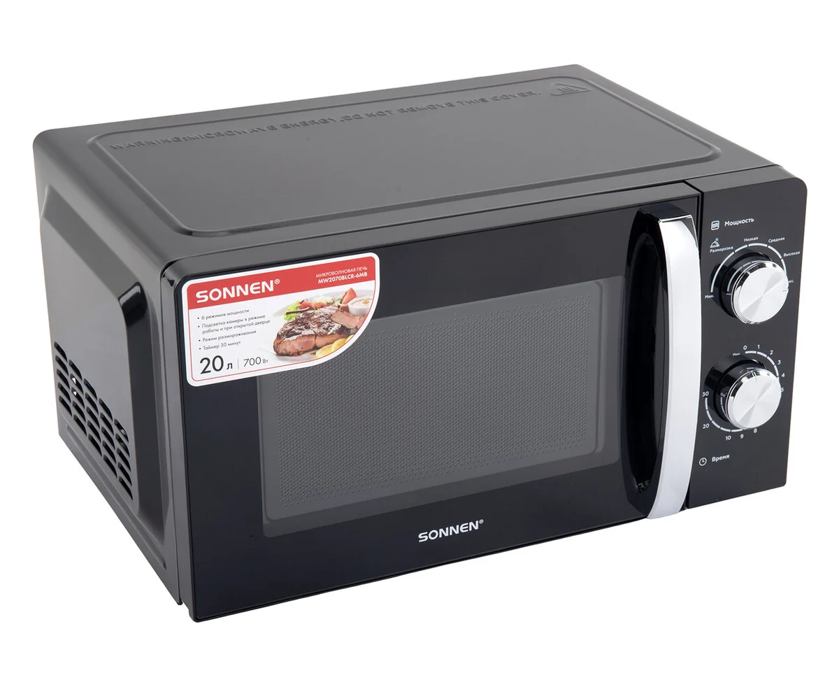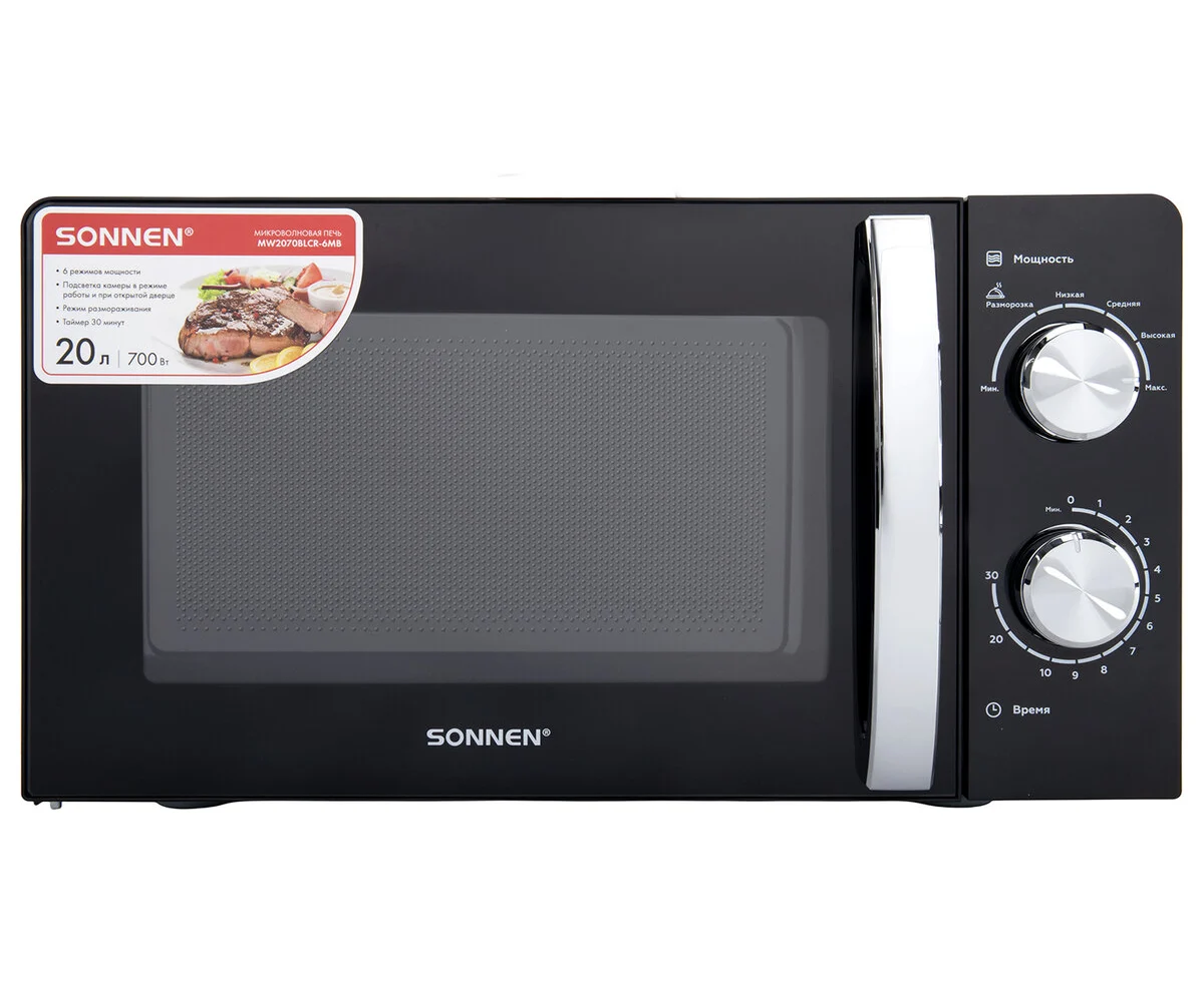 Микроволновая печь SONNEN MW2070BLCR-6MB, 20л, 700Вт, таймер, механическое управление, ручка, черная/хром