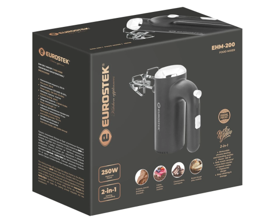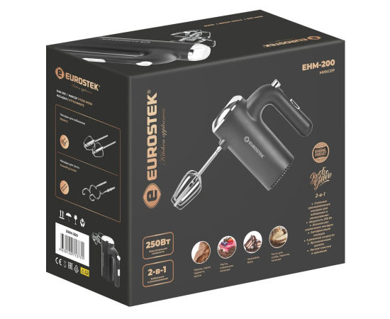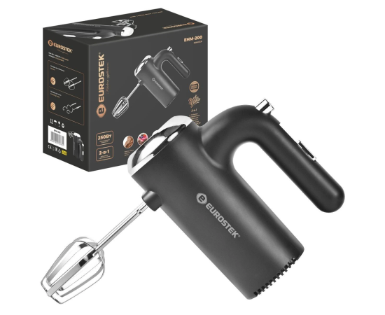 Миксер ручной Eurostek EHM-200. Мощность 250 Вт, 5 скоростей, 2 насадки для замешивания теста, насадки для взбивания, эргономичный дизайн.