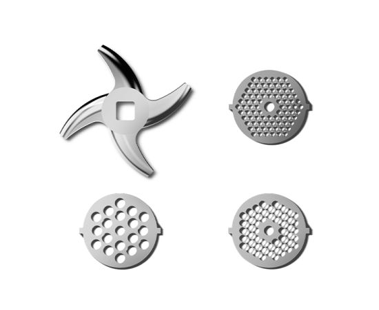 Моторный блок, блок мясорубки, шнек мясорубки, нож мясорубки, фиксирующее кольцо, перфорированные диски для различных видов фарша (2 шт.), загрузочный лоток, крышка загрузочного лотка, система хранения насадок, толкатель, основание насадки для кеббе и колбасок, формирующая насадка для приготовления кеббе, формирующая насадка для приготовления колбасок, приспособление для очистки дисков мясорубки, руководство по эксплуатации.