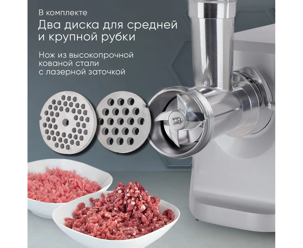 Для безопасности использования предусмотрен фиксатор насадок. В комплект входят: стальной самозатачивающийся нож, толкатель, две насадки — для кеббе и сосисок. В лотке оборудована система хранения комплектующих. Устойчивость и защиту поверхности от царапин обеспечивают ножки-присоски. Параметры модели: вес — 4,05 кг, габариты — 33,5х36,5х17 см. Прибор питается от сети 220-240 В, относится к I классу защиты от поражения электрическим током.